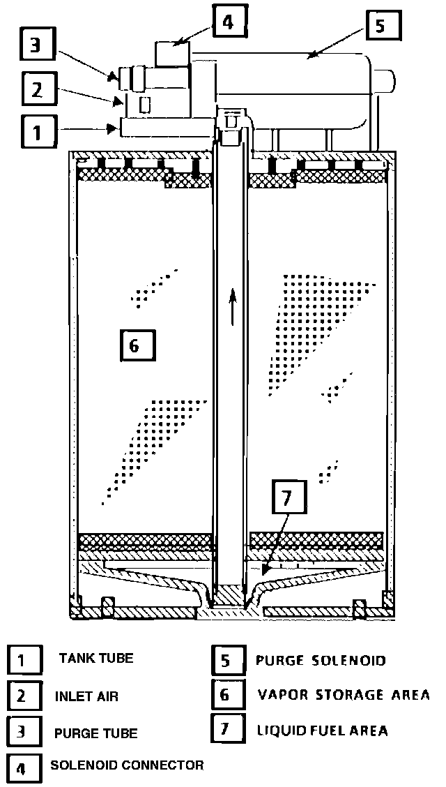Gasoline vapors, from the fuel tank, flow into the canister tube labeled "TANK". Any liquid fuel present flows into a reservoir at the bottom of the canister to protect the carbon bed above. These vapors are absorbed into the carbon. The canister is purged when the engine is running above idle speed. Ambient air is allowed into the vapor canister through the top air tube. The air mixes with the vapor and is drawn into the intake manifold to be burned.