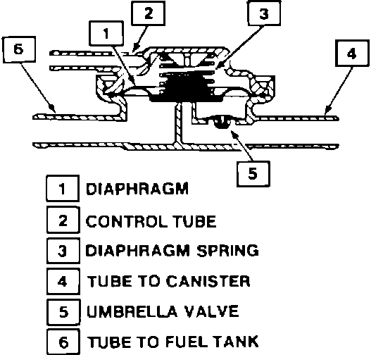 The fuel Tank Pressure Control (TPCV) valve is a combination roll-over, integral pressure, and vacuum relief valve. When vapor pressure in the tank exceeds 1.5" Hg (5 kPa) the valve opens and allows vapors to vent to the canister, and then the vapors are purged. When the tank pressure drops below the opening point of the valve, it will close. This allows fuel vapors to be trapped in the fuel tank. The TPCV valve contains an umbrella valve that opens when the fuel tank reaches approximately 0.5" Hg (1.6 kPa) of vacuum. The TPCV valve provides vacuum relief to protect against vacuum build up in the fuel tank, and roll-over protection to prevent liquid fuel from entering the canister during normal driving maneuvers.
