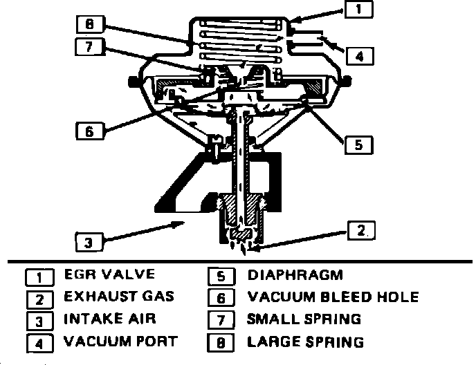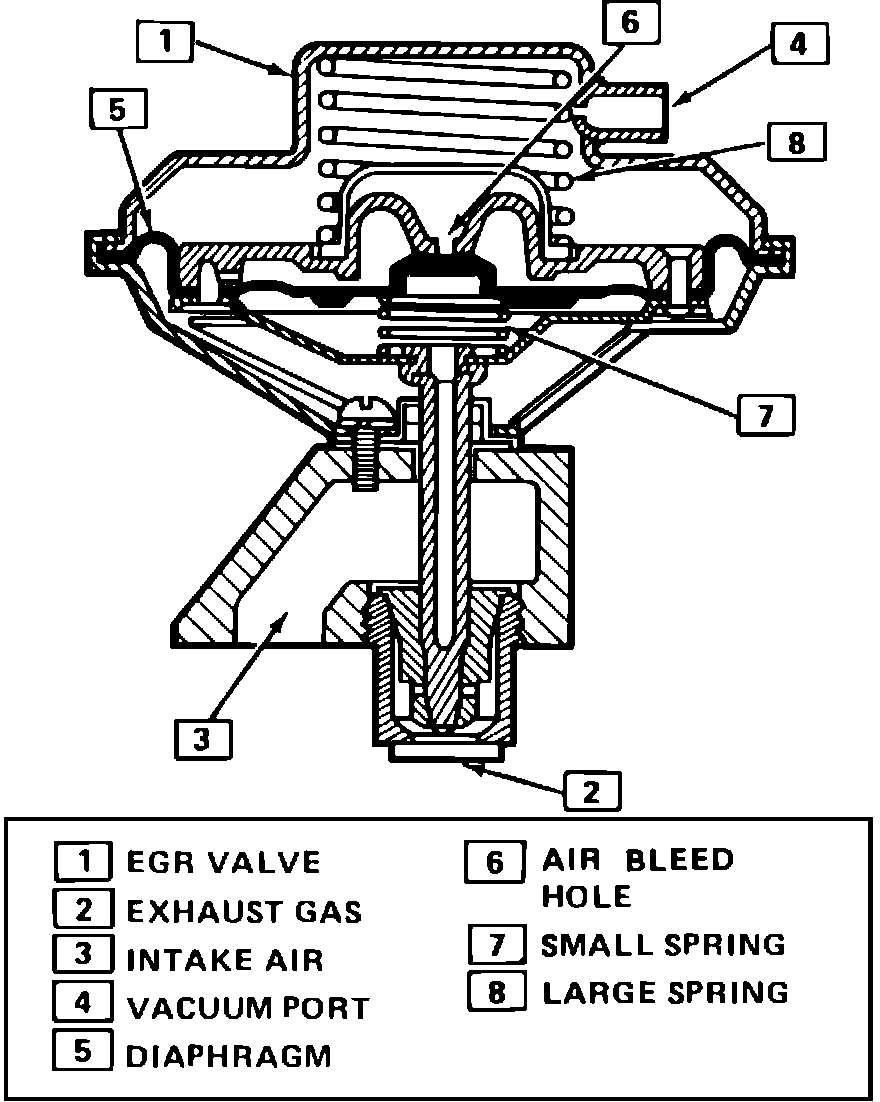 The Negative Back Pressure EGR valve has an internal vacuum bleed hole which is forced closed by a small spring when no exhaust back pressure is present. Vacuum opens the EGR valve against the pressure of a large spring. When manifold vacuum combines with exhaust back pressure, the vacuum bleed hole opens and the EGR valve closes.