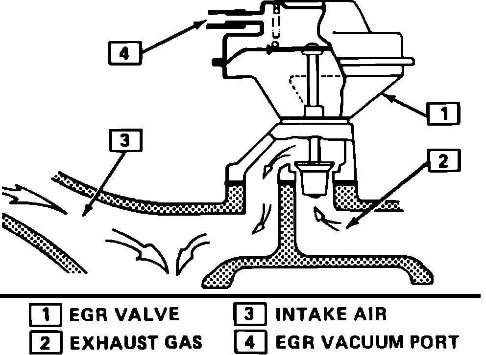 The EGR system is controlled by ported vacuum, and an ECM controlled solenoid. The EGR system routes exhaust gases from the exhaust manifold to the intake manifold at specified engine operating conditions. The EGR valve is opened to allow exhaust gases to flow into the intake manifold. The exhaust gases combine with the air/fuel mixture in the combustion chamber. Since there is less air/fuel mixture to burn in the combustion chamber, during EGR operation, the temperature is reduced to limit NOx formation. If too much exhaust gas enters, combustion will not occur. Because of this, very little exhaust gas is allowed to pass through the valve, none at idle. The valve should only open when the engine is at operating temperature and above base idle speed.