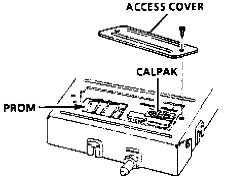 3. Remove PROM using the rocker-type PROM removal tool shown. Engage one end of the PROM carrier with the hook end of the tool. Press on the vertical bar end of the tool and rock the engaged end of the PROM carrier up as far as possible. Engage the opposite end of the PROM carrier in the same manner and rock this end up as far as possible. Repeat this process until the PROM carrier and PROM are free of the PROM socket. The PROM carrier with the PROM in it should lift off of the PROM socket easily.