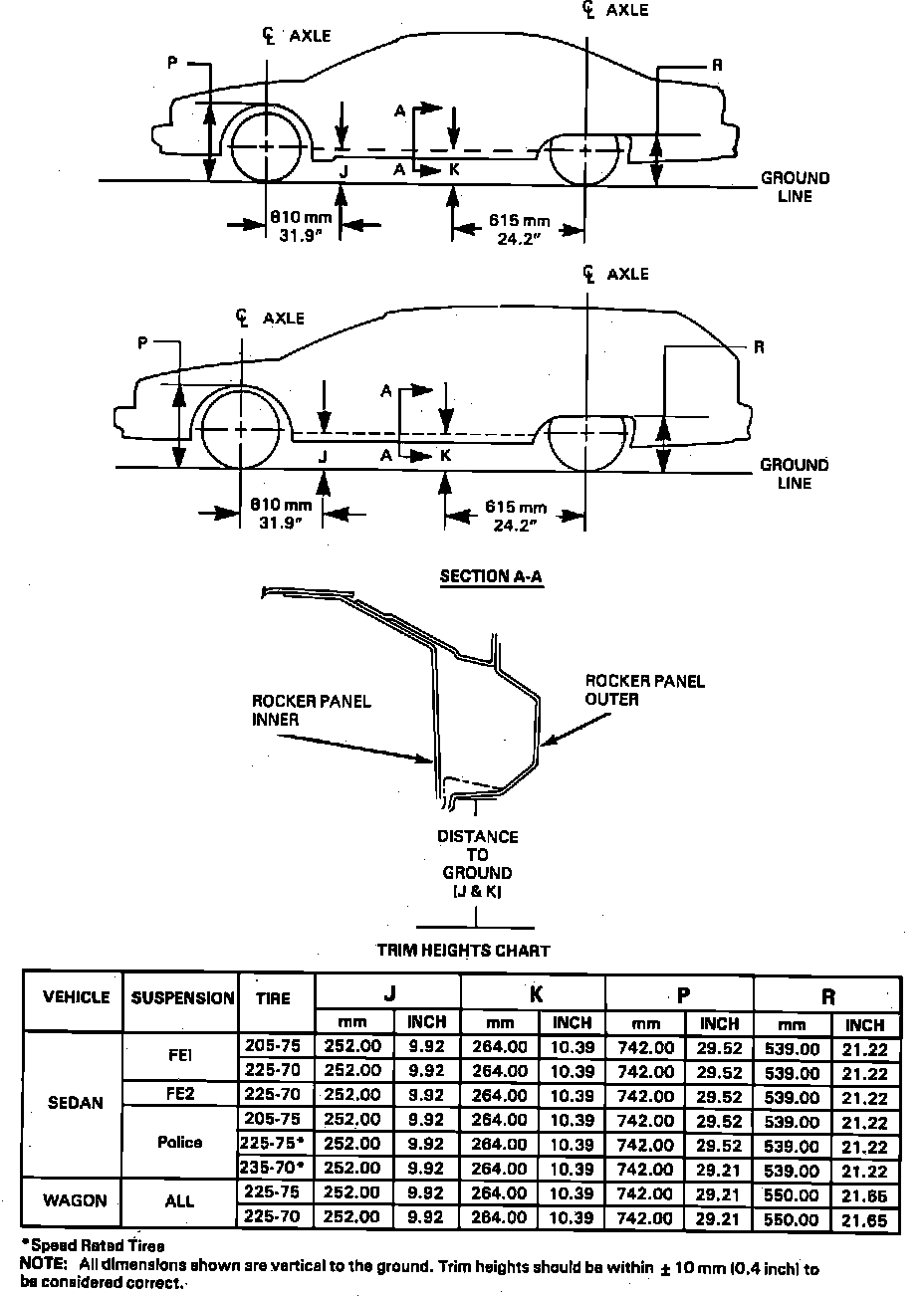 Trim heights are checked with tires at recommended pressure, fuel tank at capacity, front seat in rear position, no passengers and trunk empty, except for spare tire and jack.