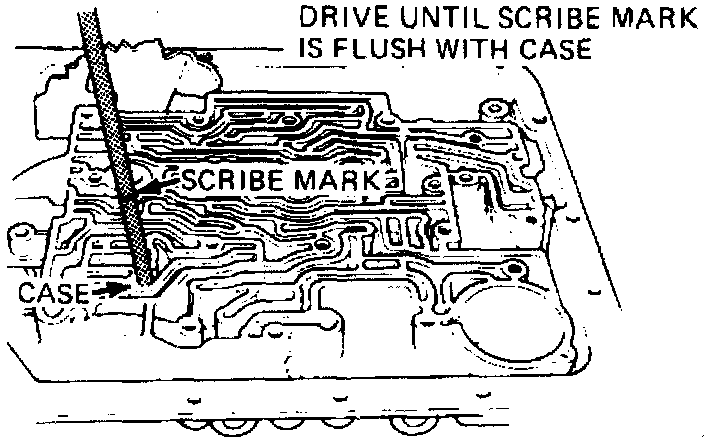 c. Using suitable tool, drive check valve assembly until seated in case. To ensure correct installation depth, scribe a mark at 1.653 inch on a 3/8 inch diameter metal rod, then seat the 3rd accumulator and ball assembly as shown. When the scribed line is flush with the case, Installation depth is correct.