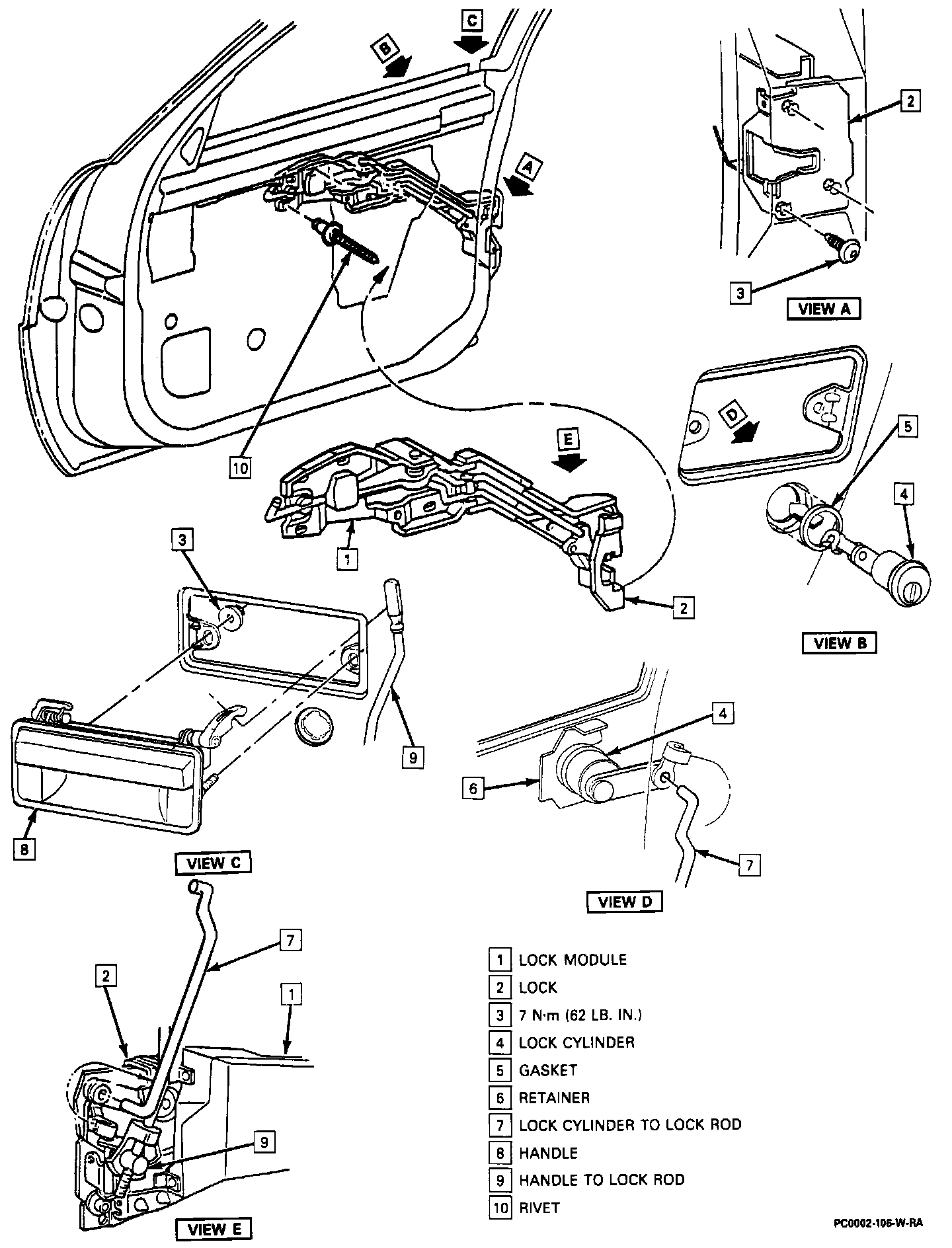 1. Lock module in position through access hole in door inner panel. Install handle to lock rod to handle lever and align module to holes in door facing.