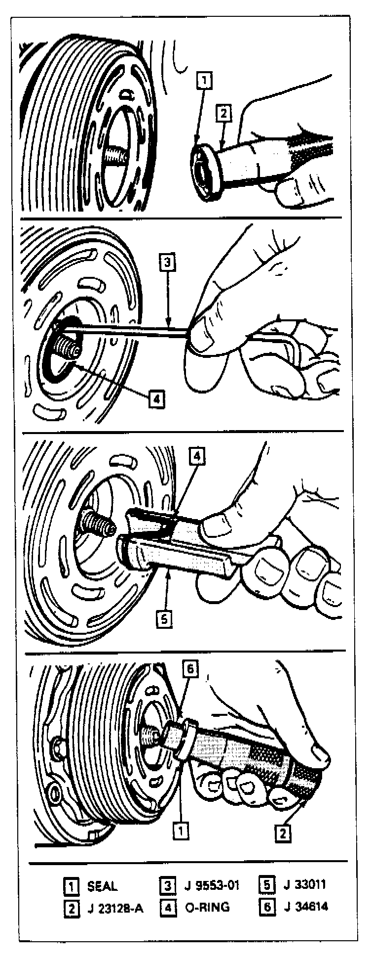 3. Dip the new seal in clean 525 viscosity refrigerant oil and assemble seal to Seal Installer J 23128-A, by turning handle clockwise. The stamped steel case side of the lip seal must be engaged with knurled tangs of installer so that flared-out side of lip seal is facing and installed towards the compressor. Install seal protector J 34614, in the seal lip and place over the compressor shaft, and push the seal in place with a rotary motion or place the seal protector J 34014 over end of compressor shaft, and slide the seal onto the shaft with a rotary motion until it stops. Take care not to dislodge the O-ring. Be sure the seal makes good contact with the O-ring. Disengage the installer from the seal and remove the installer J 23128-A and the seal protector J 34614.