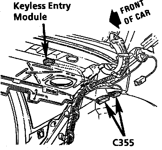 The Keyless Entry Receiver (Theft Deterrent Module) is located on the RH top side of rear shelf.