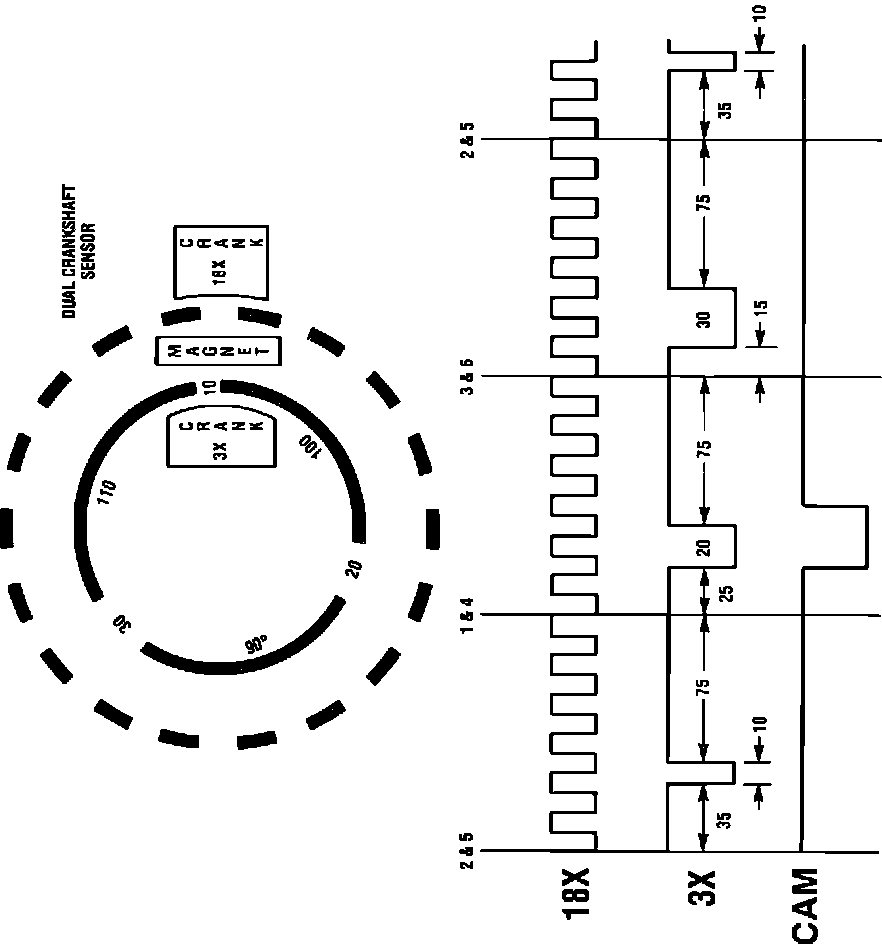 The ignition control module interprets the 18X and 3X "ON-OFF" signals as an indication of crankshaft position, and must have both signals to "fire" the correct ignition coil. Since the 3X interrupter gaps in the harmonic balance each have a different width (10°, 20°, & 30°), the PCM can tell the difference between the three 3X signals. Correct ignition coil firing sequence is determined based on how many 18X signals occurs during the 3X signal.