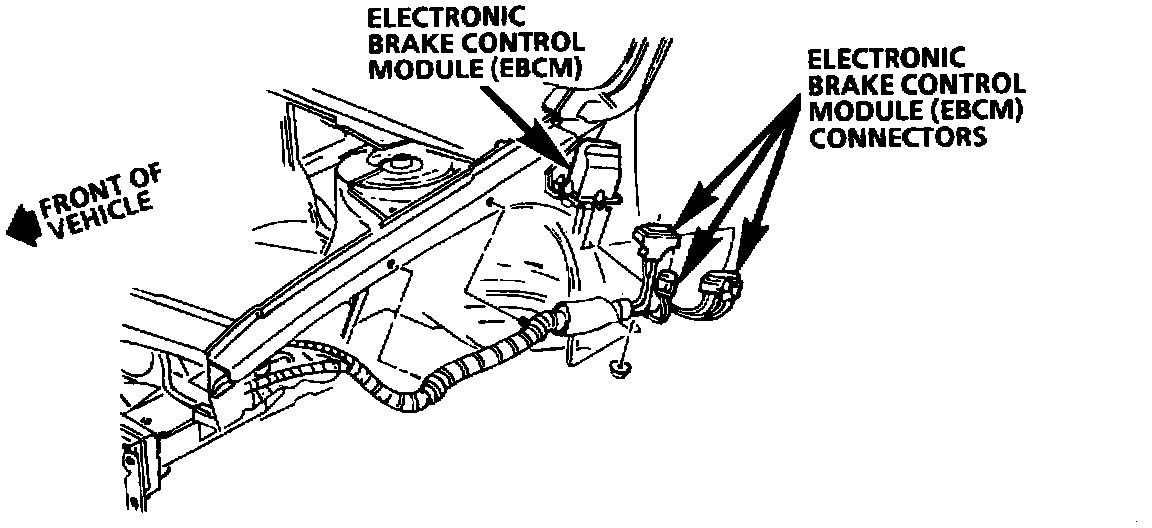 The electronic brake control module (EBCM) is located in the LH rear of the engine compartment.