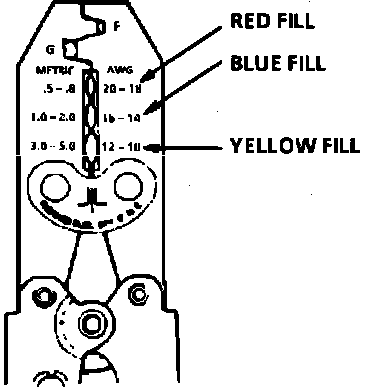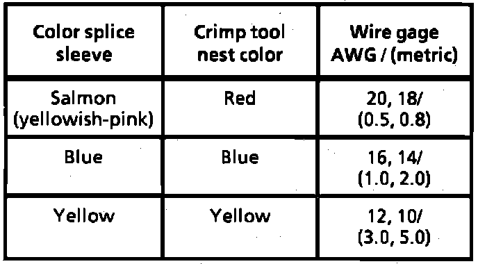 Select the proper splice sleeve according to wire size. The splice sleeves and tool nests are color coded. Using a crimp tool, Fig. 13, position the splice sleeve in the proper color nest of the hand crimp tool. Place the splice sleeve in the nest so that the crimp falls midway between the end of the barrel and the stop.