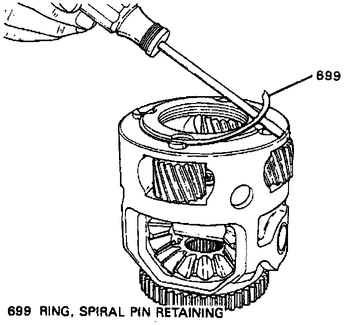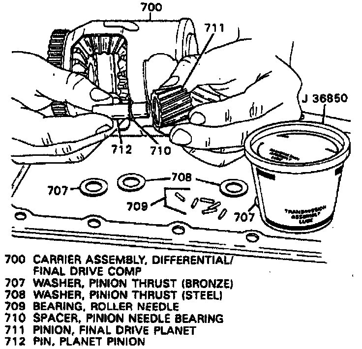 k. Install pinion gear shaft (712), ensuring care is taken not to dislodge needle bearings, then install snap ring.