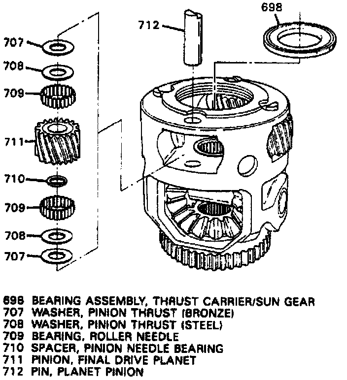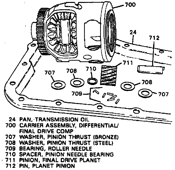 c. Tilt final drive, then remove pinion gear (711), washers (707, 708 and 710) and needle bearings. Needle bearings will fall out of pinion gear, use the bottom pan to catch bearings.