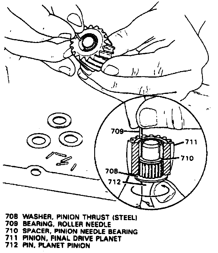d. Inspect washers, needle bearings and pinion shaft for wear. Discard bronze washer (707) and replace with steel washer (708).