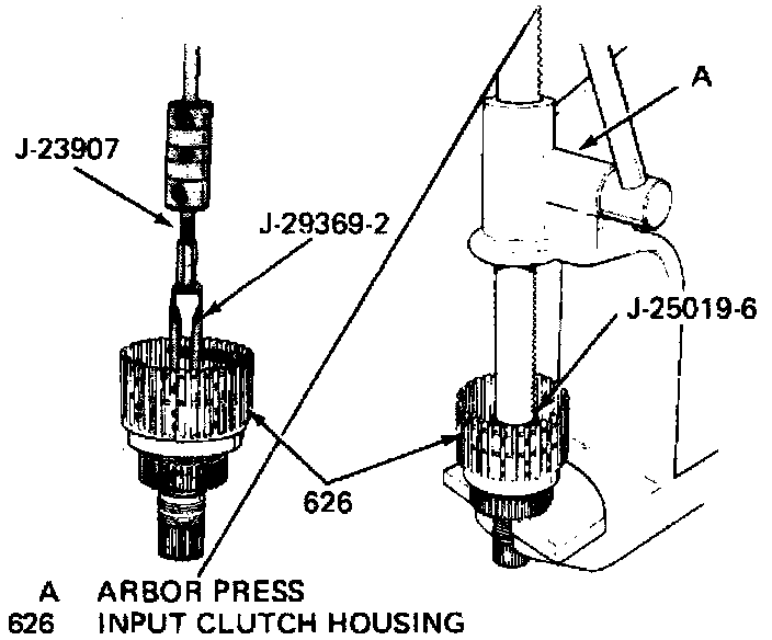 89. Ensure proper operation of input clutch assembly by applying approximately 90 psi of air pressure to air passages marked C and D and check for proper clutch apply.