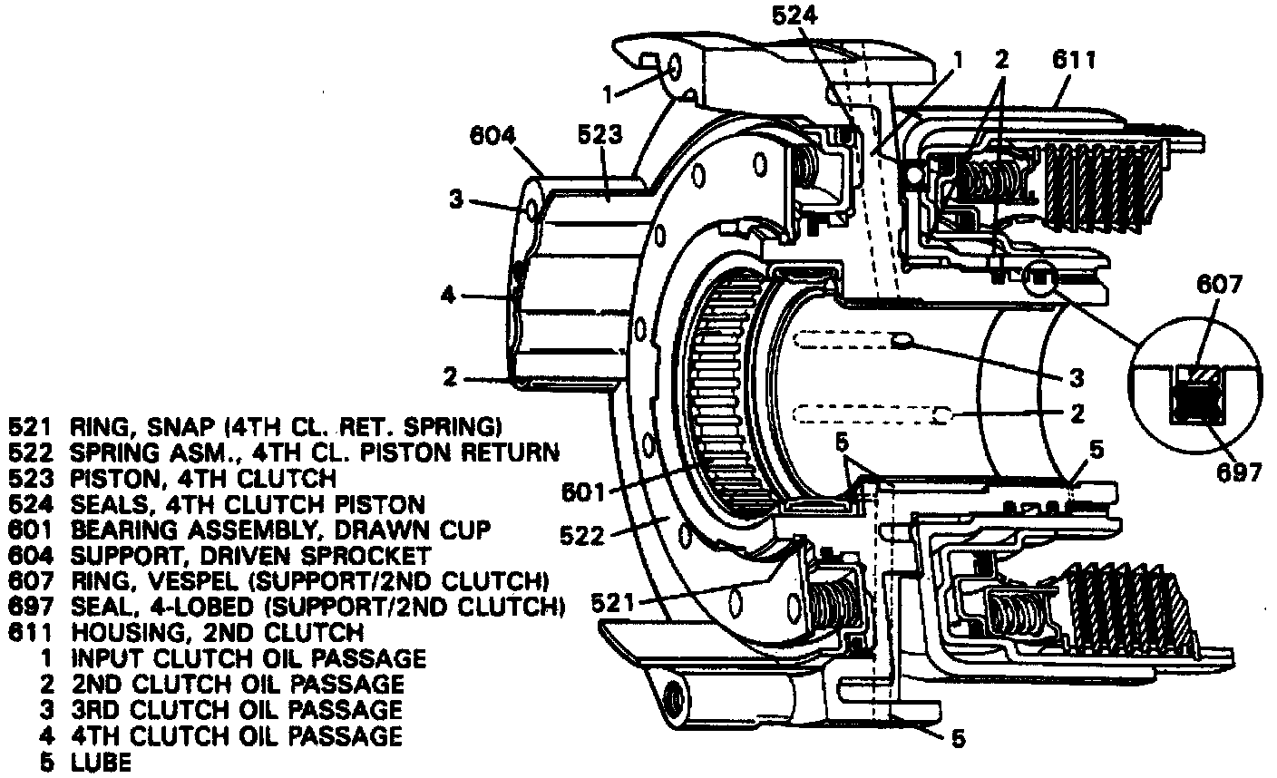 67. Inspect clutch housing and shaft for interconnected oil passages, damaged clutch hub, damaged or worn bushings, damaged 4th clutch shaft seal and damaged or cut oil seals.