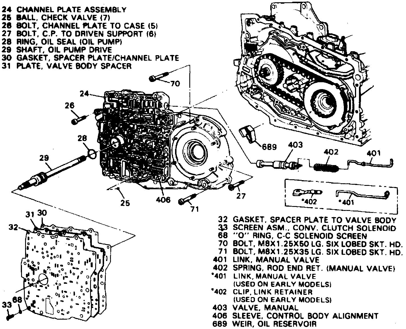 149. Insert converter clutch solenoid screen along with O-ring through opening in spacer plate. On early design transaxles, the converter clutch solenoid screen is located in valve body and does not use an O-ring seal.