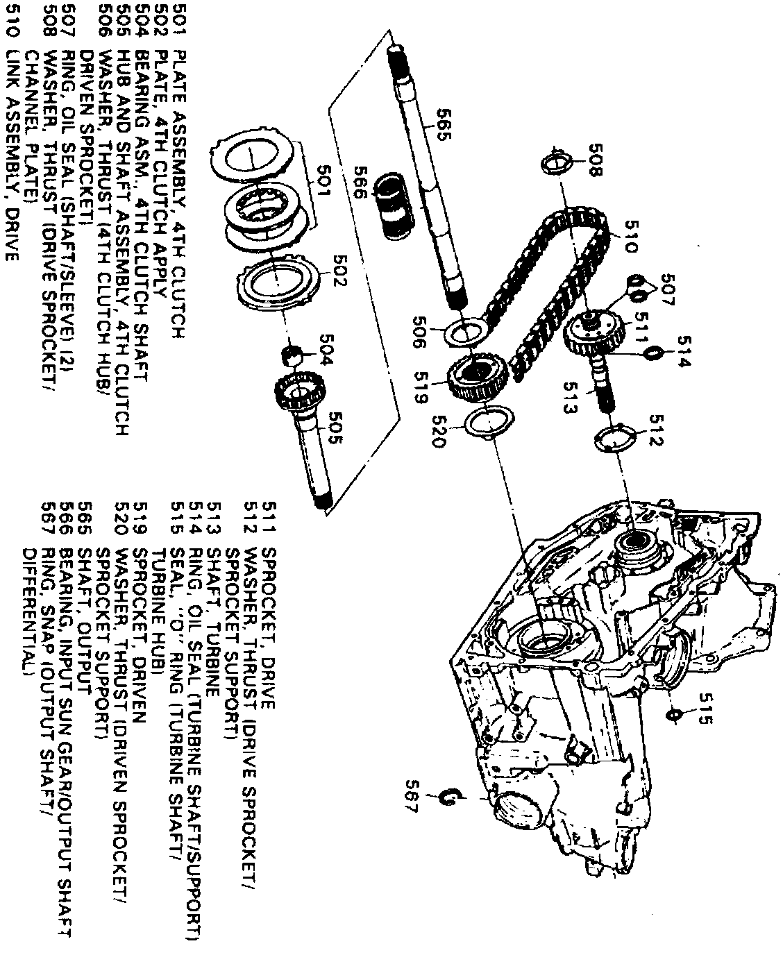 143. Position driven sprocket thrust washer on channel plate, then mount channel plate on case and install control body alignment sleeve in channel plate. Ensure 4th clutch plate and apply plate tangs are properly aligned with channel plate lugs.