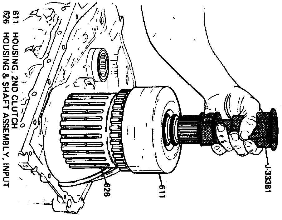 108. Install input clutch, roller clutch and sprag assembly into case using J-33381 or equivalent. Do not install 2nd clutch, 2nd clutch thrust bearing or thrust washer at this time.