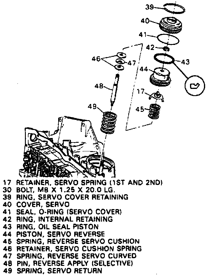 a. Place spring retainer onto pin, noting reverse servo pin is larger than 1-2 servo pin, the 1-2 servo spring retainer has a step that faces spring and the reverse servo has a wave spring and two retainers with the wave spring installed between the retainers.