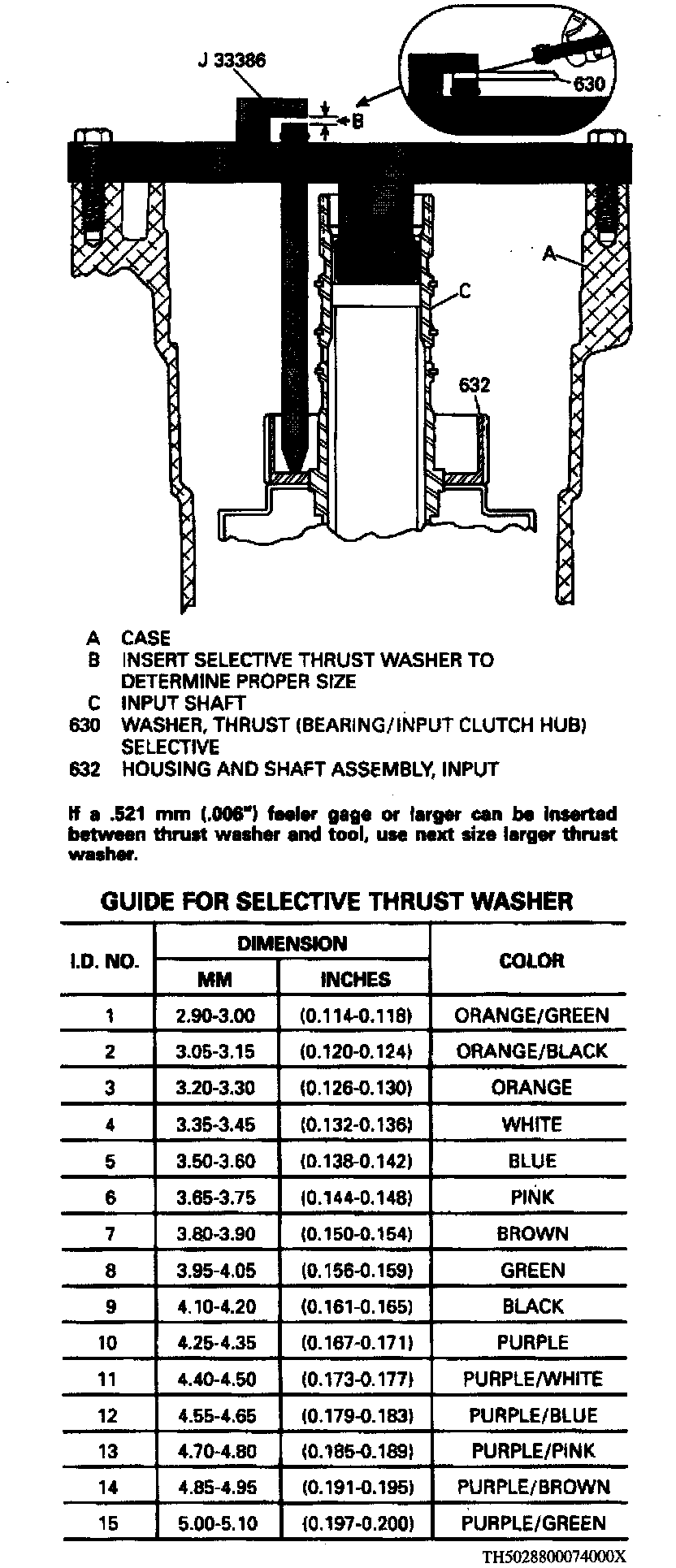 c. Insert selective thrust washer into opening "B," check fit using feeler gauges, and select proper thrust washer by referring to chart.