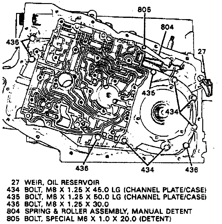 145. Install manual valve and link, and secure with spring or clip, then position oil weir between channel plate and case.