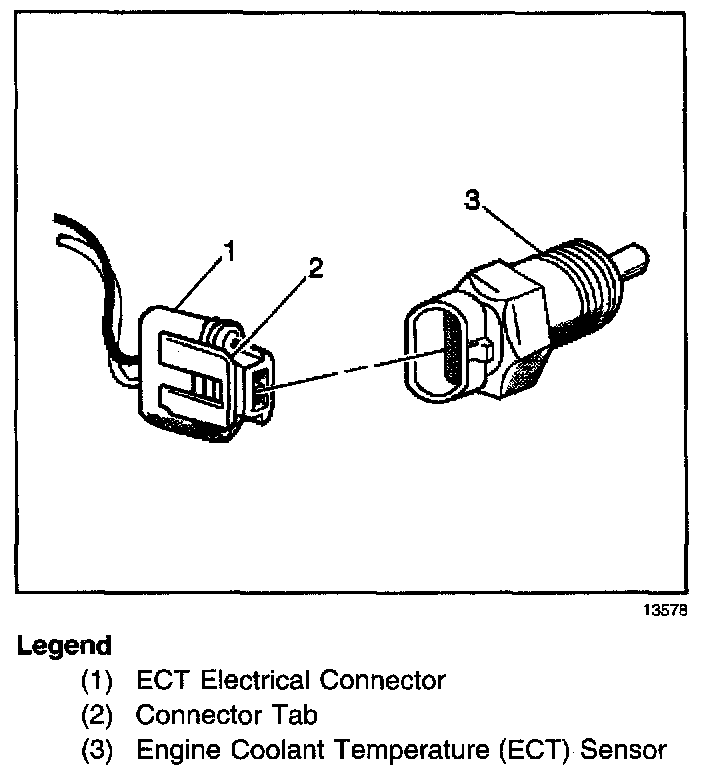 The PCM supplies a 5 volt signal to the ECT sensor through a resistor in the PCM and monitors the terminal voltage. Since this forms a series circuit to ground through the ECT sensor, high sensor resistance (low temperature) will result in high PCM terminal voltage. When the ECT sensor's resistance is low (high temperature), the terminal voltage will be drawn lower. This terminal voltage indicates engine coolant temperature to the PCM.
