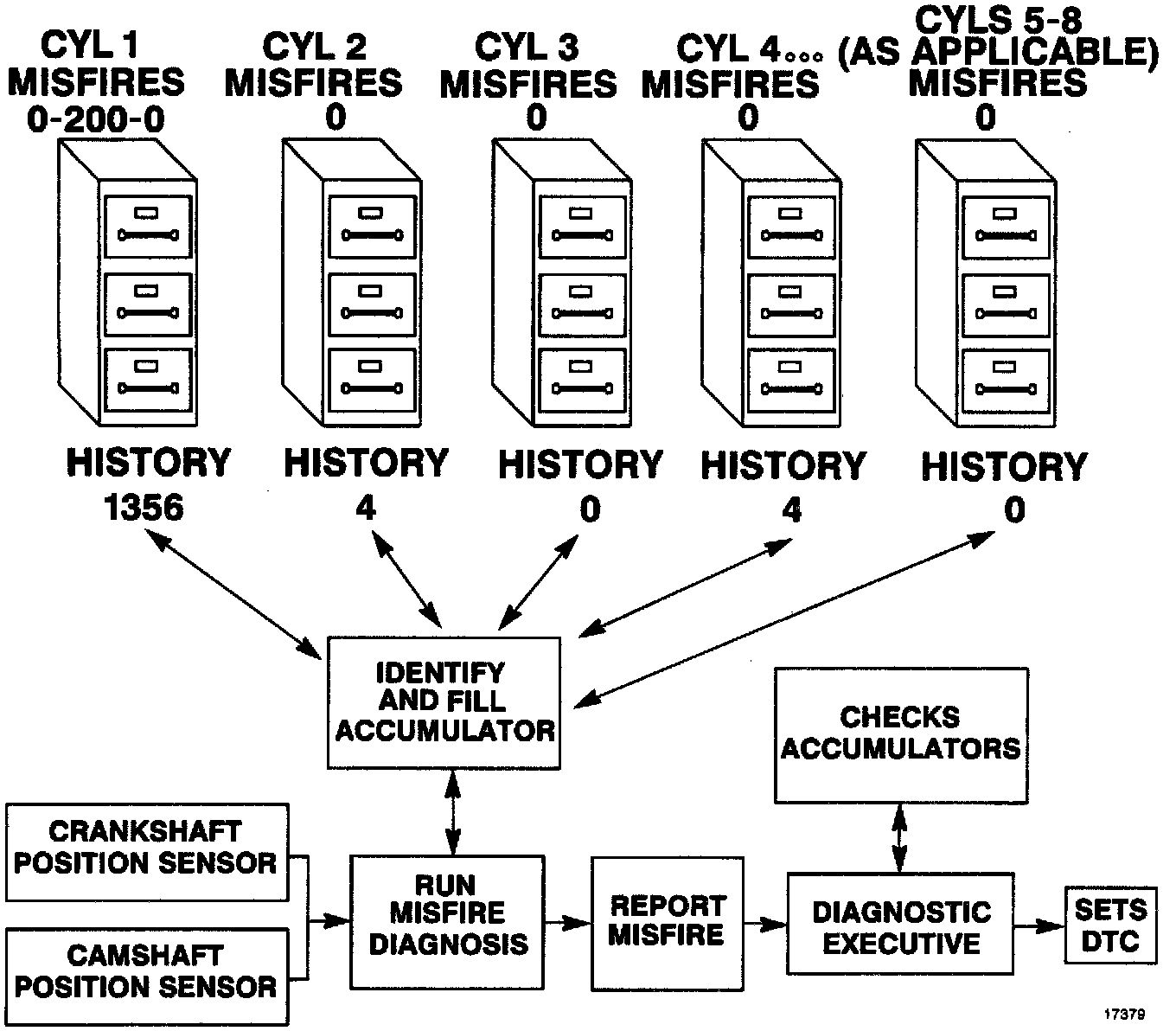 The Misfire counters graphic illustrates how these misfire counters are maintained. If the misfire diagnostic reports a failure, the Diagnostic Executive reviews all of the misfire counters before reporting a DTC. This way, the Diagnostic Executive reports the most current information.