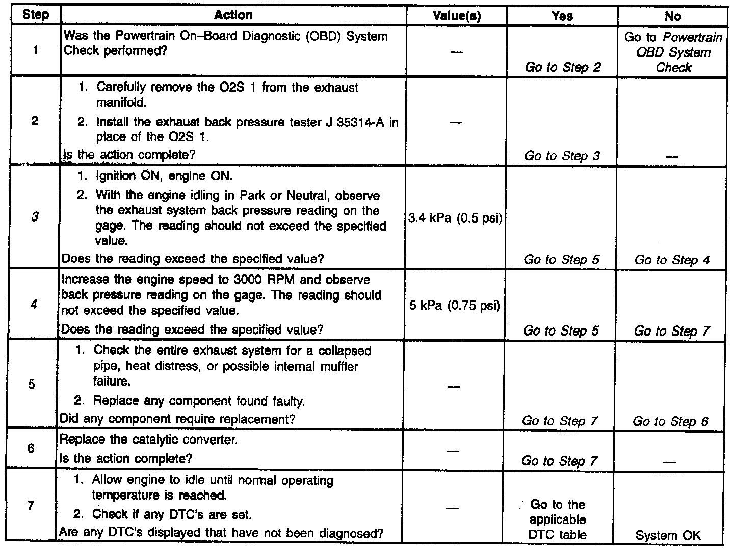 Proper diagnosis for a restricted exhaust system is essential before any components are replaced. Using the Restricted Exhaust System Check table should determine if the exhaust system is restricted. The best place for checking the exhaust system is at the 02S 1 location. Once the test is completed, coat threads with anti-seize compound P/N 5613695 or equivalent prior to 02S re-installation.
