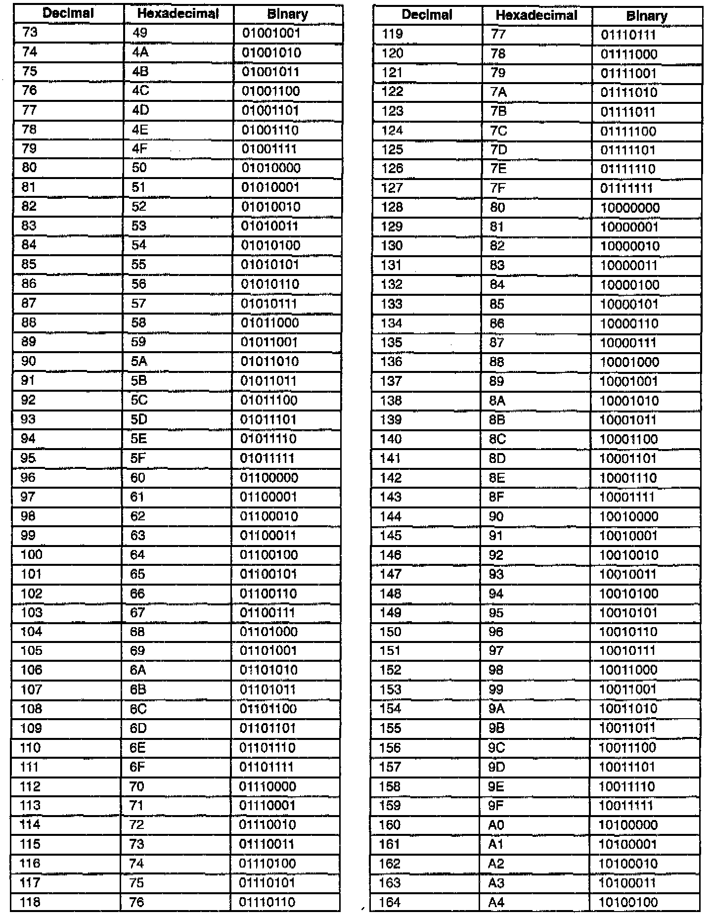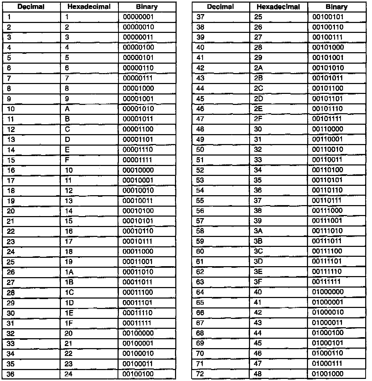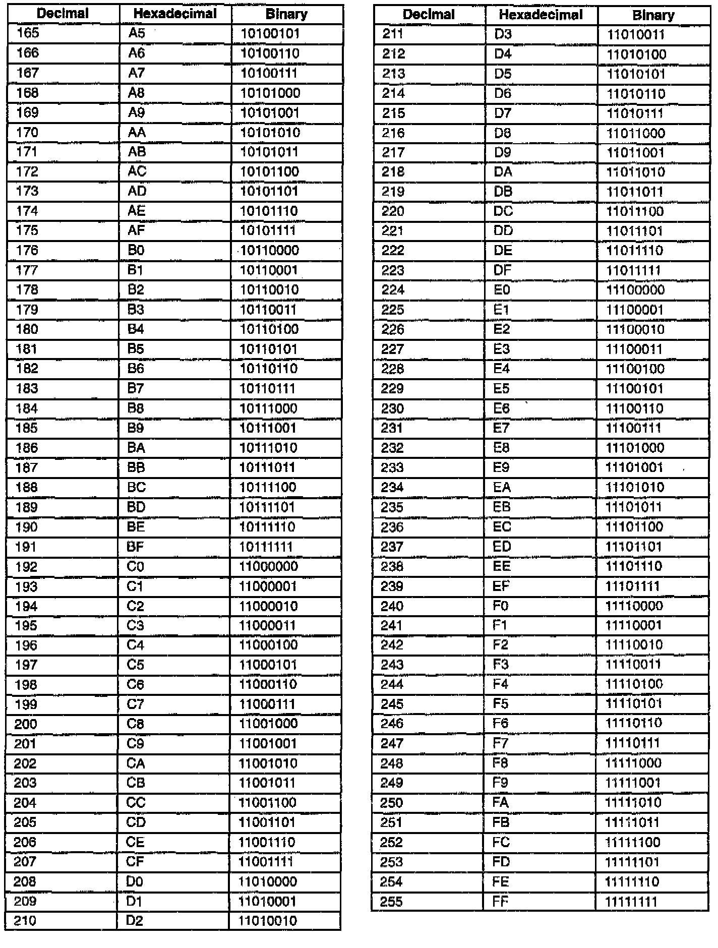 Decimal/Hexadecimal/Binary Conversion Table: