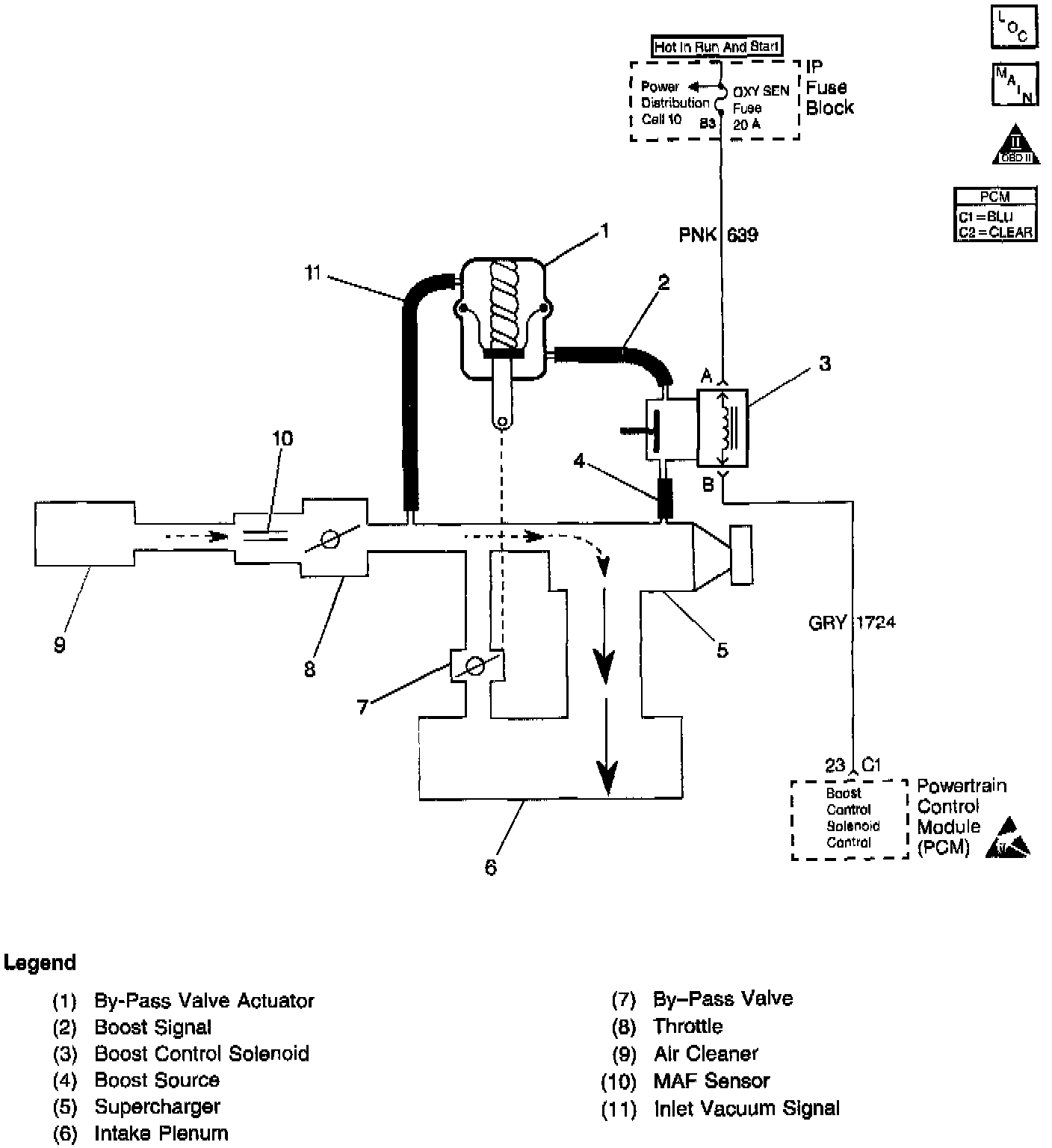 Under most conditions, the PCM commands the boost control solenoid to operate at a 100% duty cycle (ON) to allow full boost pressure upon demand. However, if reverse gear is selected or the PCM detects rapid deceleration or engine load is extremely high, reduced boost pressure is desired. Under these conditions, the PCM commands the boost control solenoid to operate at a 0% duty cycle (OFF), which opens the bypass valve. With the Bypass valve open, boost pressure is reduced by recirculating intake air back through the supercharger inlet.