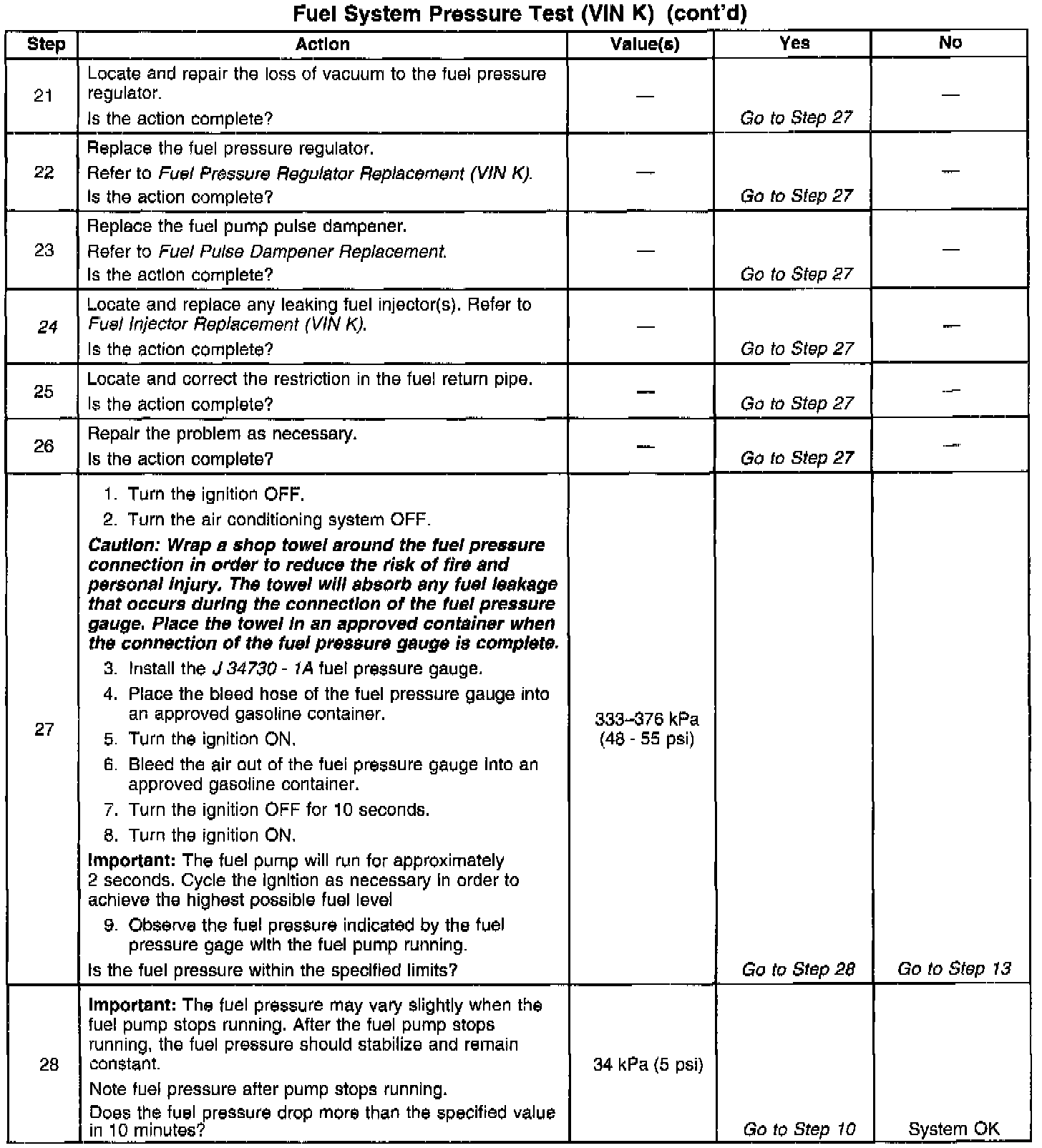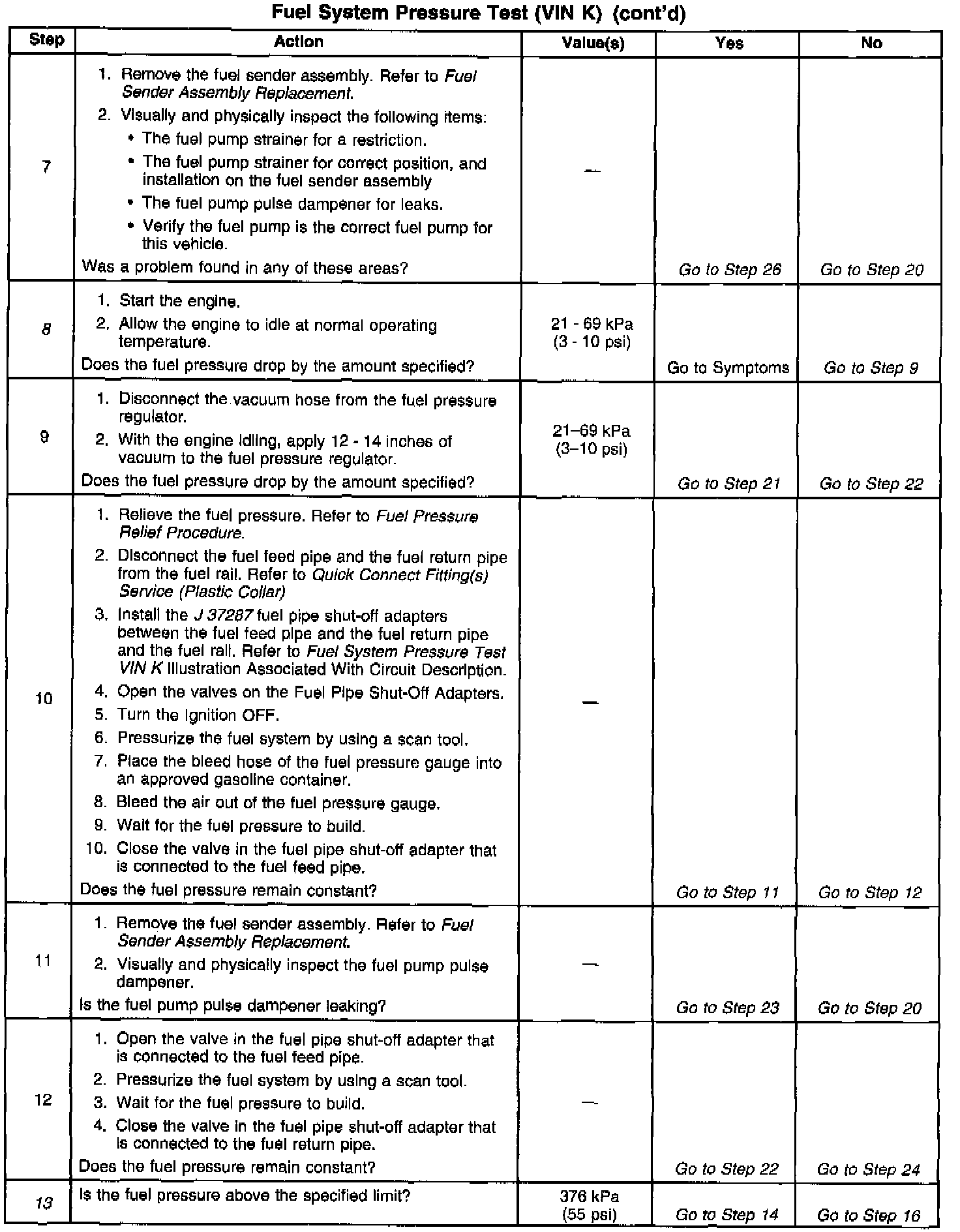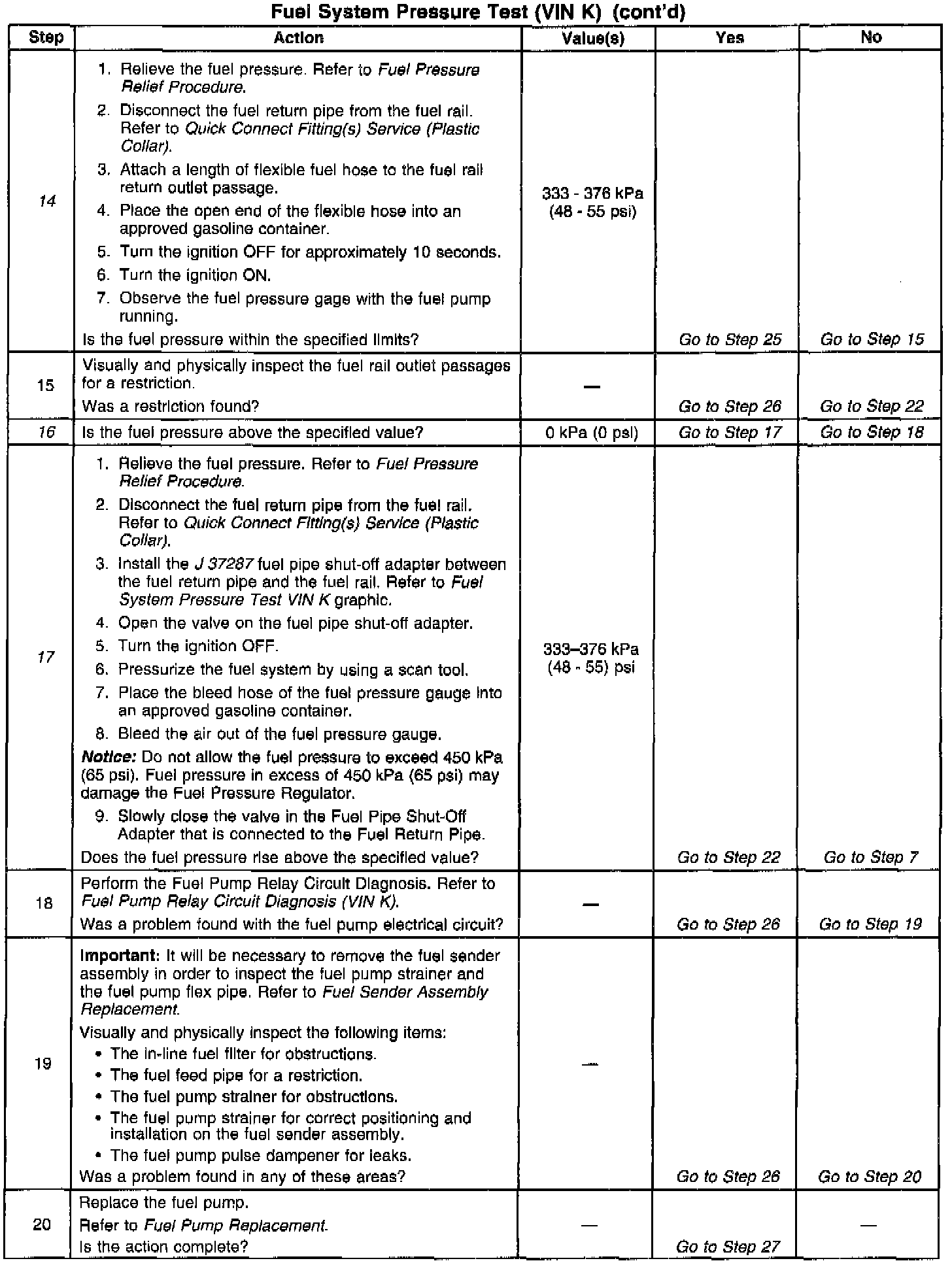 14. This test determines if the high fuel pressure is due to a restricted fuel return pipe or if the high fuel pressure is due to a faulty fuel pressure regulator.