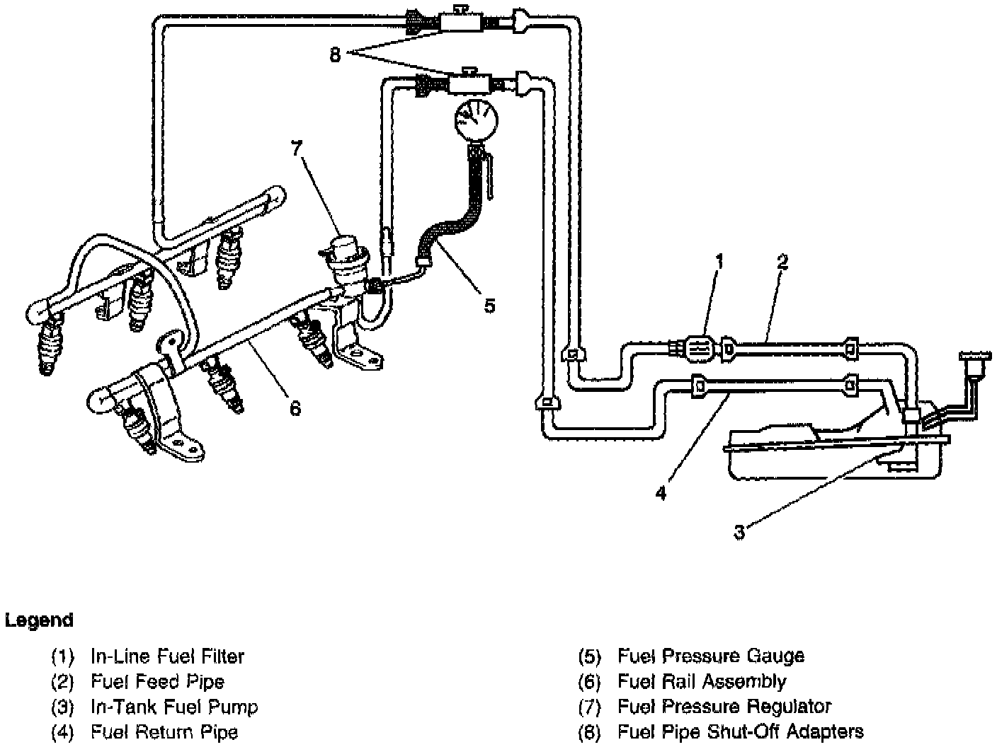 When the ignition switch is turned ON, the Powertrain Control Module (PCM) will turn ON the in-tank fuel pump. The in-tank fuel pump will remain ON as long as the engine is cranking or running and the PCM is receiving reference pulses. If there are no reference pulses, the PCM will turn the in-tank fuel pump OFF 2 seconds after the ignition switch is turned ON or 2 seconds after the engine stops running. The in-tank fuel pump is an electric pump, attached to the Fuel Sender Assembly. The in-tank fuel pump supplies fuel through the fuel feed pipe, and in-line fuel filter to the Fuel Rail Assembly. The fuel pump is designed to provide fuel at a pressure above the pressure needed by the fuel injectors. A fuel pressure regulator, attached to the fuel rail, keeps the fuel available to the fuel injectors at a regulated pressure. Unused fuel is returned to the fuel tank by a separate fuel return pipe. The fuel pressure gauge and fuel pipe shut-off adapters are used for fuel system diagnosis.