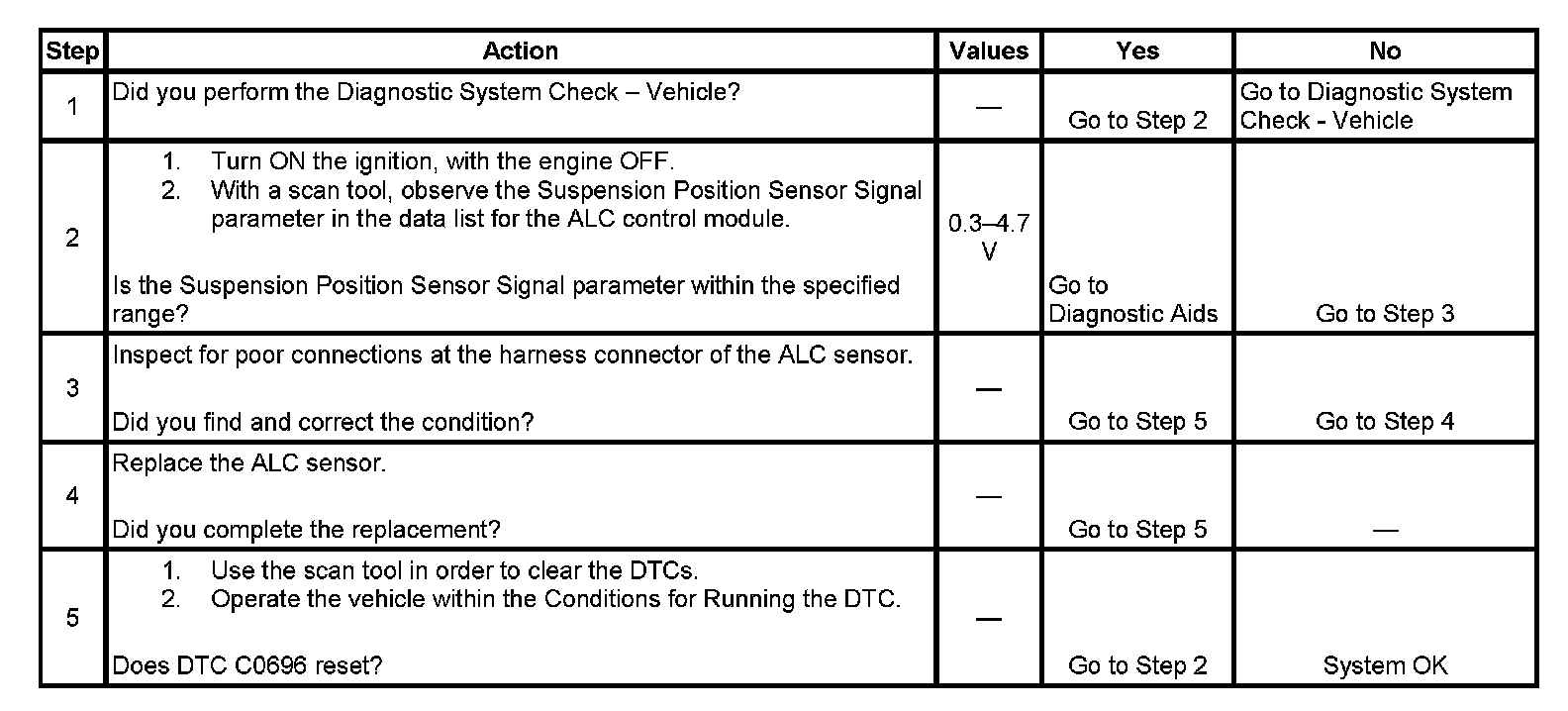 ^ The control module is internal to the ALC sensor, and no external circuits are involved. If DTC C0696 sets, and cannot be cleared, replace the ALC sensor. Refer to Automatic Level Control Sensor Replacement