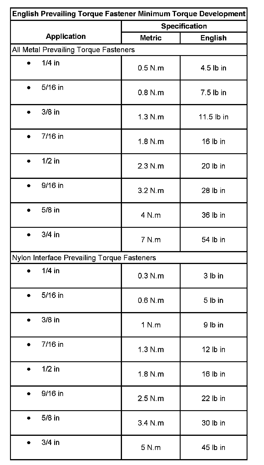 Metric Prevailing Torque Fastener Minimum Torque Development