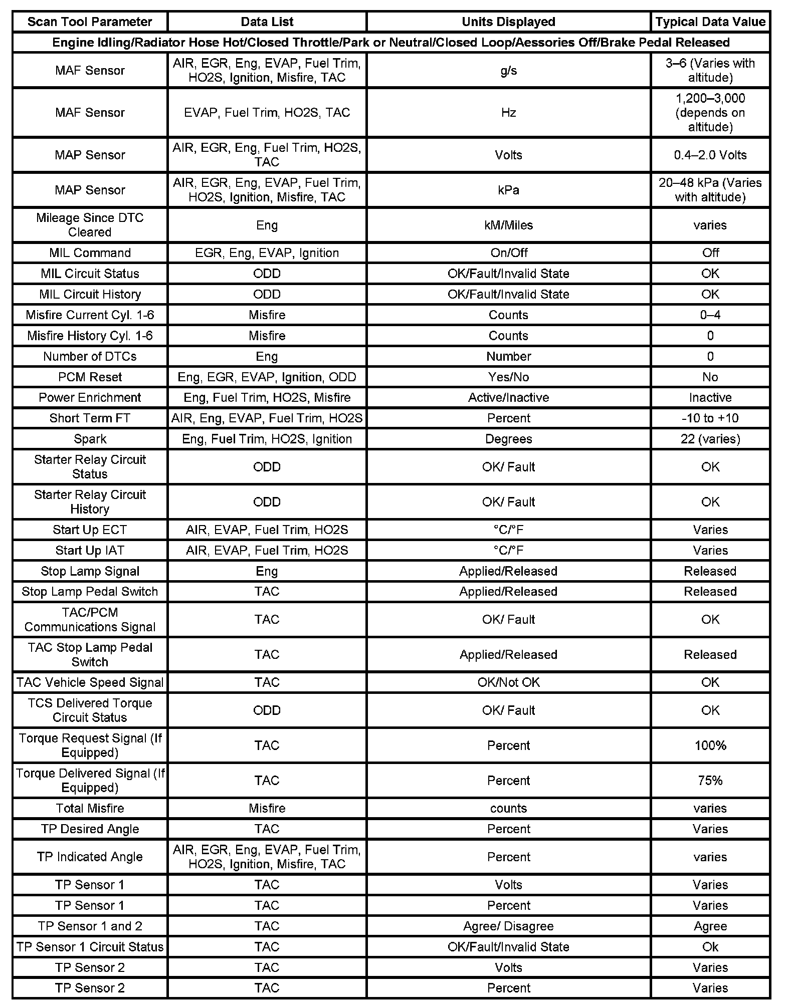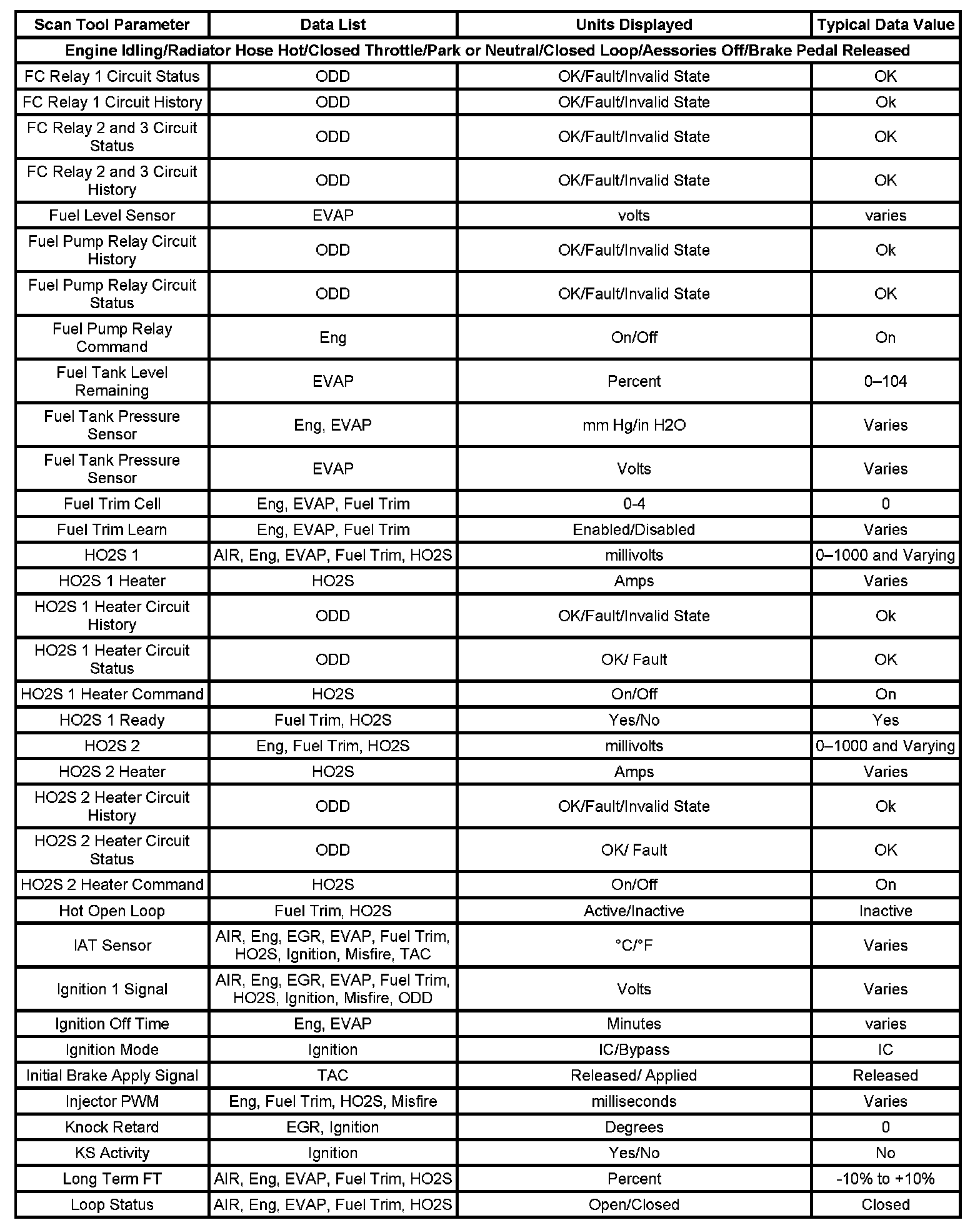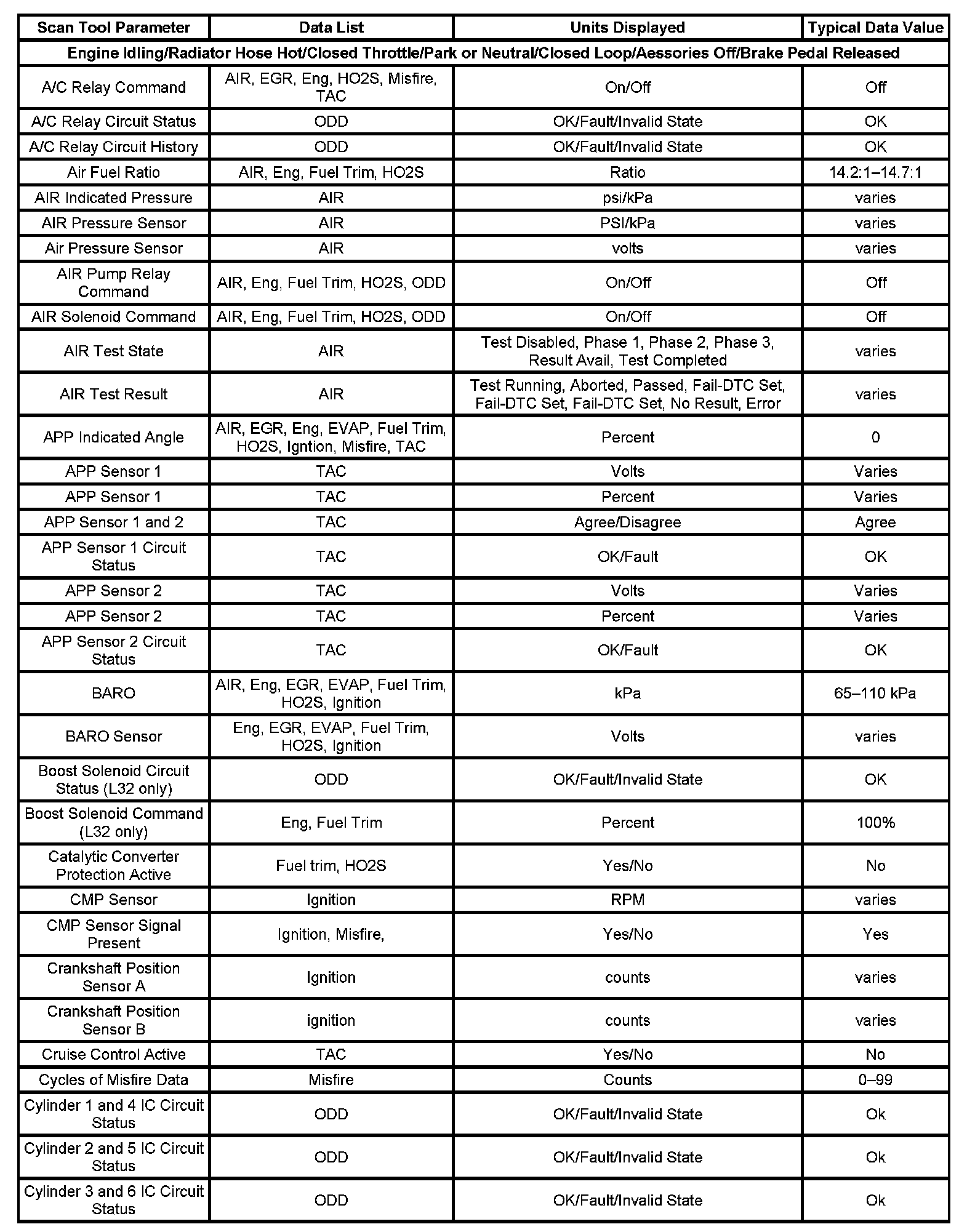 The column labeled Data List indicates where a parameter can be located on the scan tool. Refer to the scan tool operating manual for the exact locations of the data lists. The following is a description of each term listed: