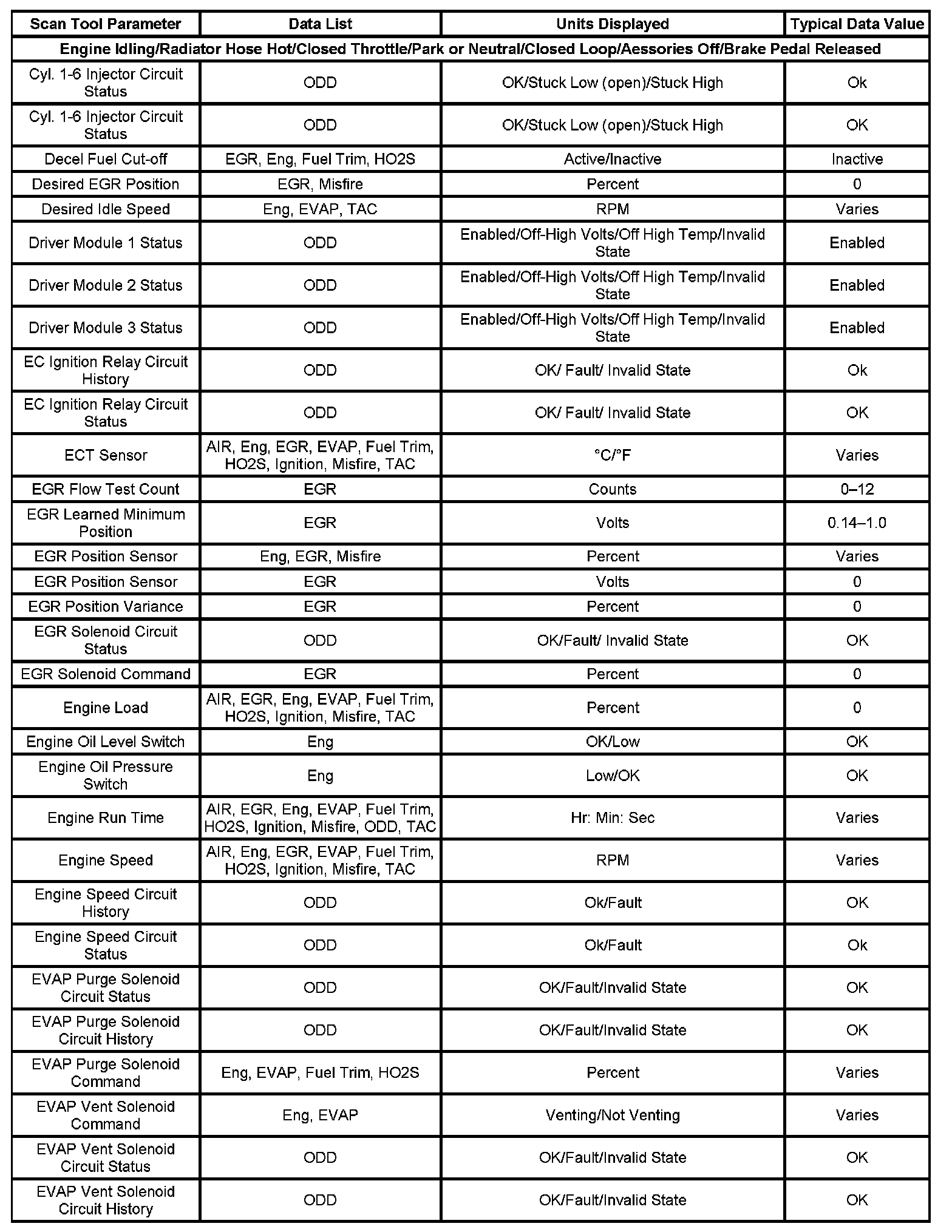 The Engine Scan Tool Data List contains all engine-related parameters that are available on the scan tool. The list is arranged in alphabetical order. A given parameter may appear in any one of the data lists, and in some cases may appear more than once, or in more than one data list in order to group certain related parameters together.
