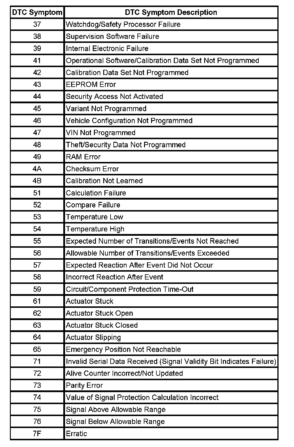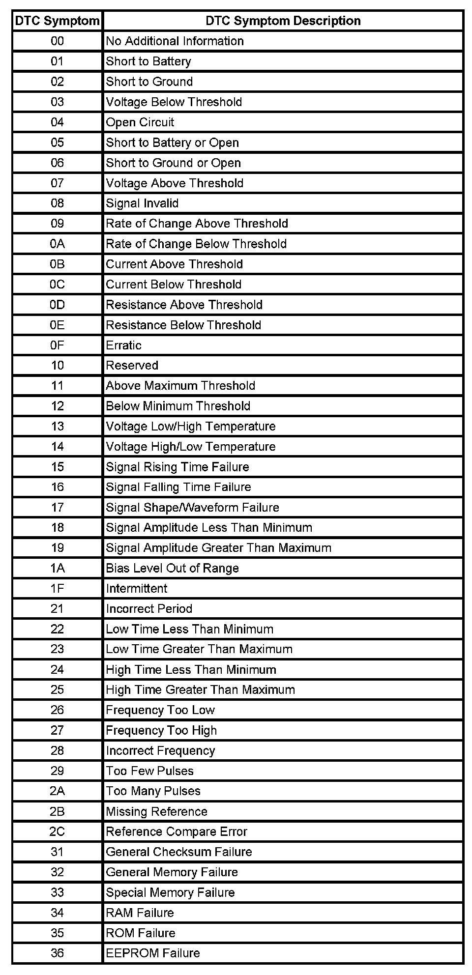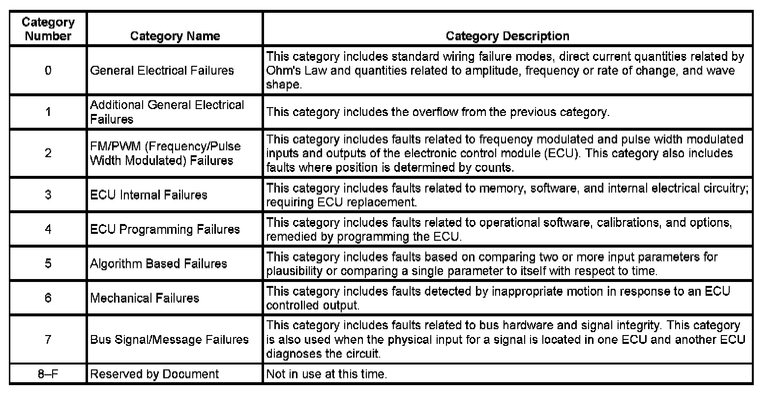 The DTC symptom is made up of 2 alphanumeric digits. The first digit following the DTC indicates the DTC symptom category. There are 16 possible categories available in the range of 0 through the letter F. Currently there are 8 categories in use, 0 through 7. These 8 categories together with their definitions are given.
