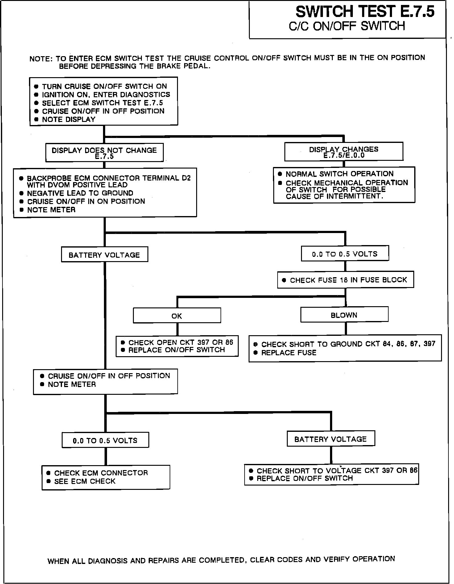 This test detects the open and close of the cruise control switch mounted on the dash at terminal D2 of the PCM/ECM. This test should be performed before attempting tests E.7.6 and E.7.7. This test verifies that there is power to the switches and PCM/ECM.