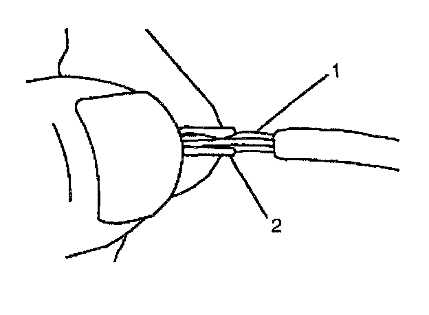7. Center the splice clip (2) over the stripped wires (1) and hold the clip in place.