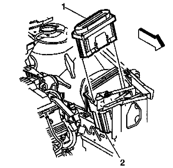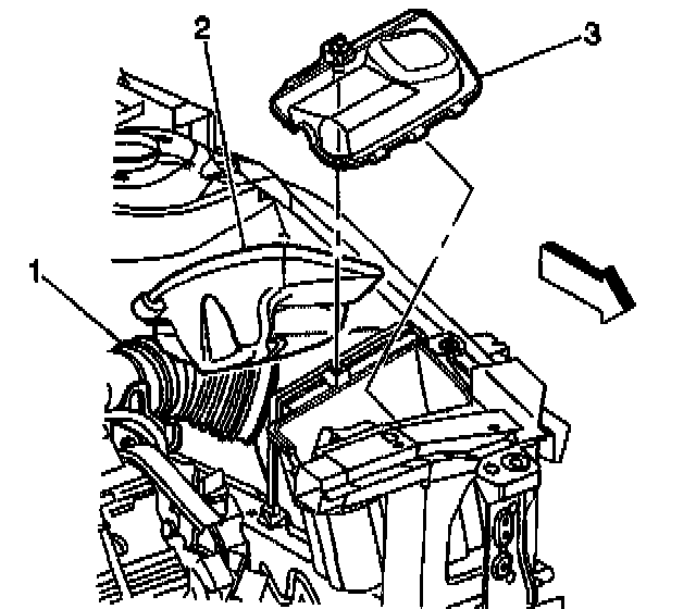 5. Pull the intake air duct/resonator assembly (2) up and rotate towards the rear of the engine compartment.