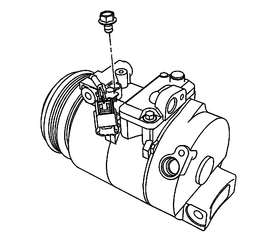 2. Add the total system capacity of PAG oil into the A/C compressor oil drain. Refer to Refrigerant System Specifications [1][2]Fluid Type Specifications.