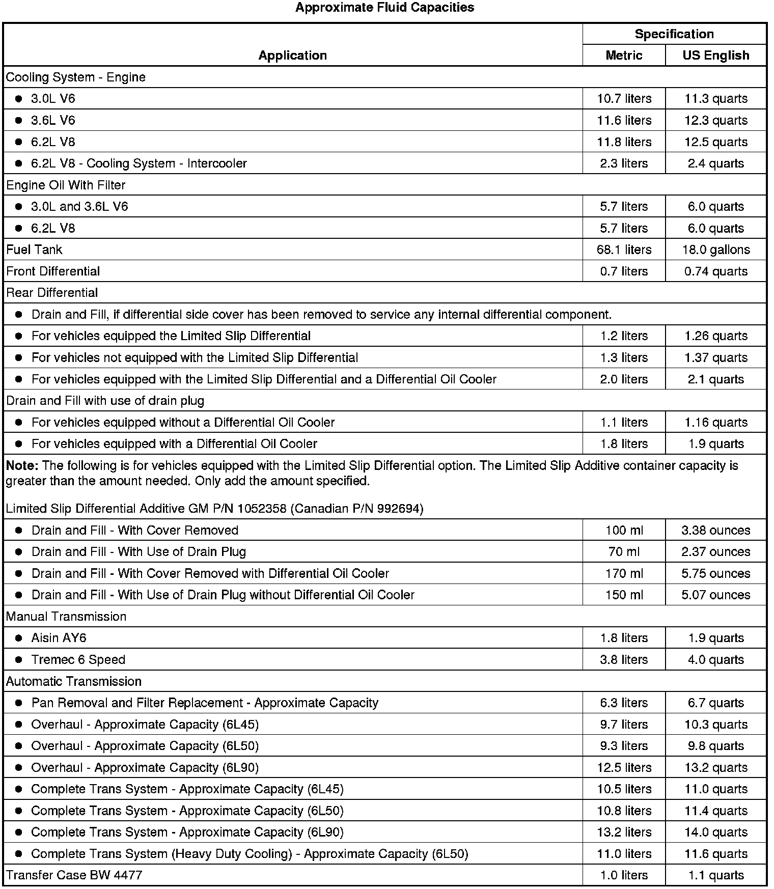 The following approximate capacities are given in US English and metric conversions. See Fluid and Lubricant Recommendations (USA and Canada) Fluids for more information. All capacities are approximate. When adding, be sure to fill to the approximate level, as recommended in this manual. Recheck fluid level after filling.