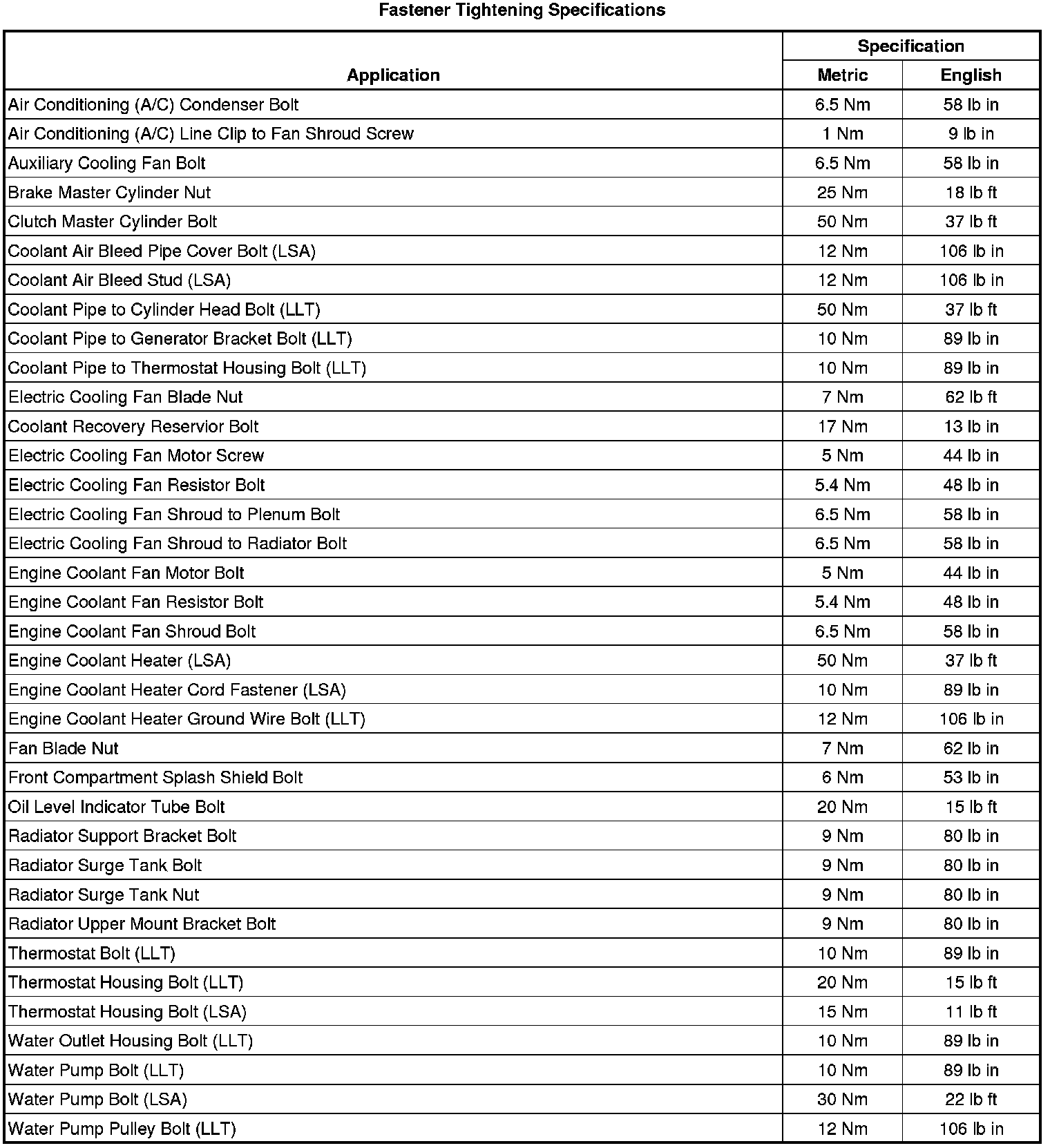 Fastener Tightening Specifications