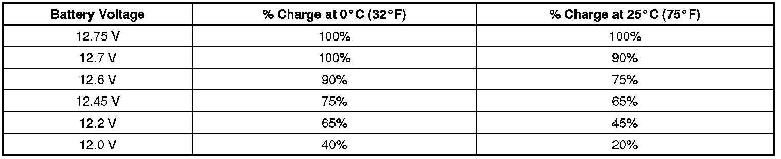 4. Measure the battery voltage at the battery terminals. Refer to the following table to determine the state of charge according to the estimated battery temperature: