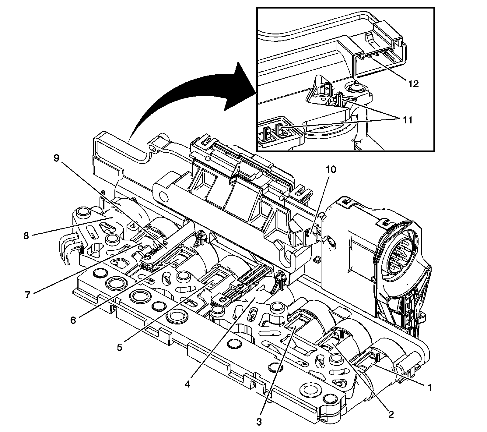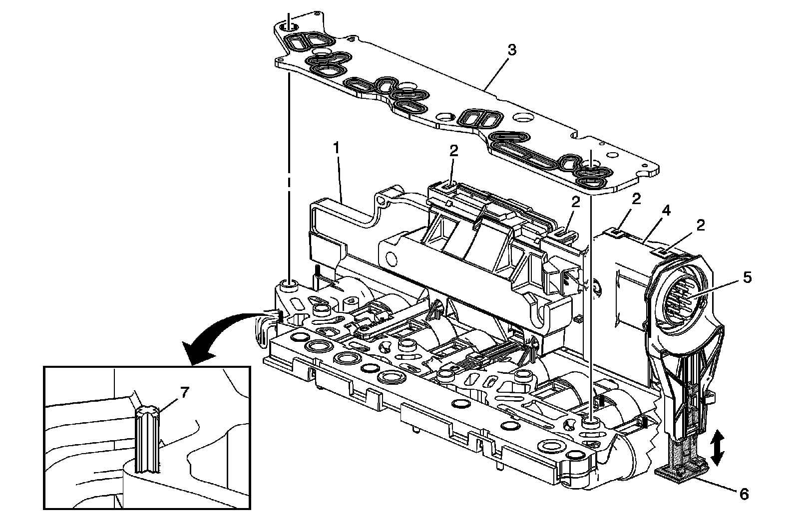 1. Inspect the control solenoid valve assembly housing (1) for damage, cracks, or parting seam (4) separation. Inspect all housing lock tabs (2). Any defect will need to be evaluated for critical operation. Ensure all screws along the control solenoid valve assembly housing are present. Remove and closely examine the filter plate assembly (3) for sediment or debris attached to the screen. If sediment or debris is found on the filter screen, be sure to inspect the solenoid supply or control ports that correspond to location of the debris on the filter plate screen. Inspect the filter plate gasket for proper sealing. If poor sealing is found, be sure to inspect the affected solenoid fluid port entrance and exit for sediment or debris deposits. Thoroughly flush the solenoid cavity with GM Brake Parts Cleaner and replace the filter plate assembly (3). It is not necessary to remove all clutch plate soot from the entire surface of the control solenoid valve assembly housing. Inspect the control solenoid valve assembly filter plate retaining tabs (7). Broken or missing tabs do not require the control solenoid valve assembly be replaced. The filter plate can still be adequately aligned using the bolt hole sleeves. Early design control solenoid valve assembly use four filter plate retaining tabs (7).