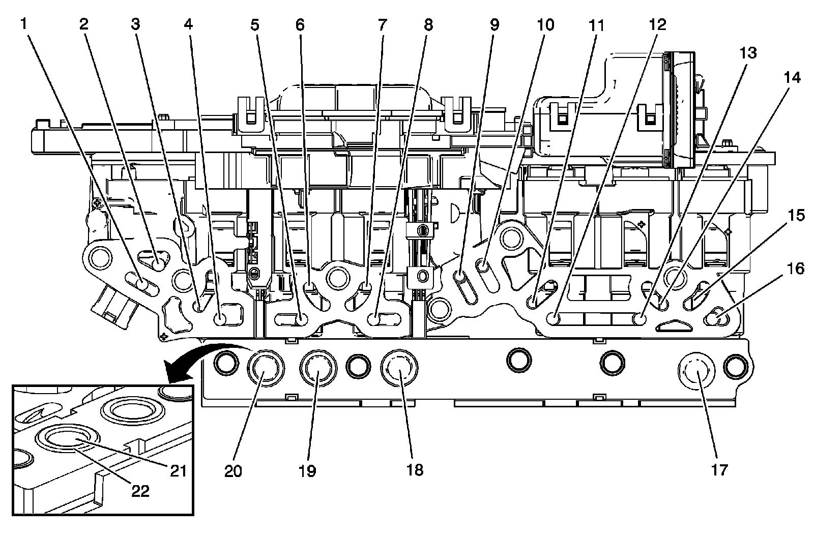 2. Inspect the four transmission fluid pressure (TFP) switches (17-20) for trapped debris or sediment. Any sediment or debris found under a switch membrane requires the control solenoid valve assembly to be replaced. Check all TFP switch membranes (21) for cracks, cuts or pin holes. Ensure all TFP switch gaskets (22) are secure and are not deformed, torn, or improperly seated. As necessary, thoroughly rinse debris and sediment from the top of the switches. It is not necessary to remove the clutch plate soot from the entire surface of the control solenoid valve assembly housing.