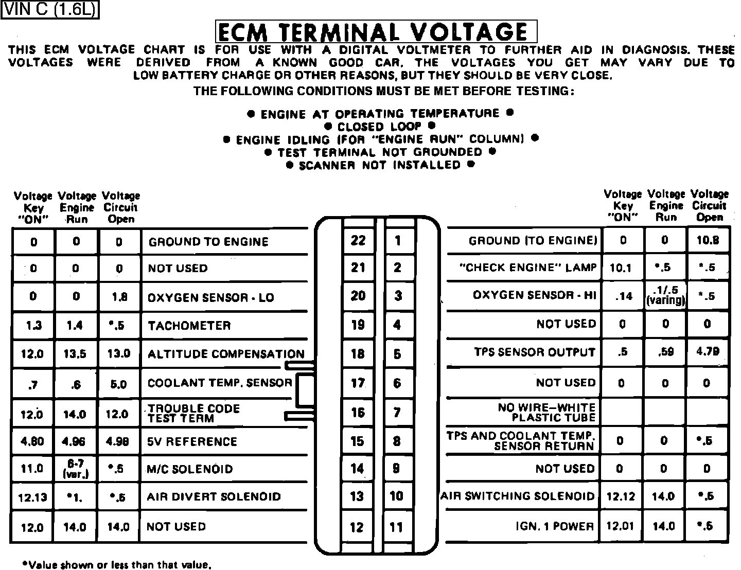 Fig. 017 - ECM Connector Terminal Identification & Voltage Specifications.: