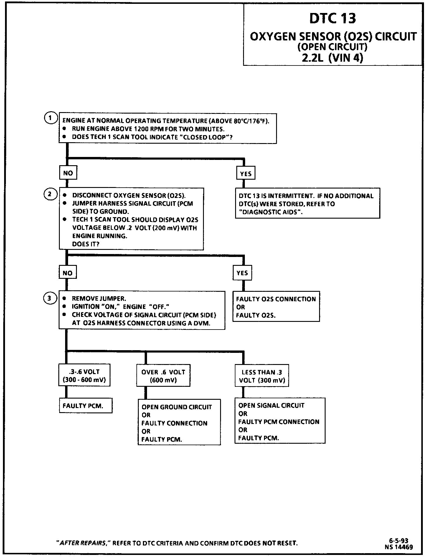 Diagnostic Aids: Normal Tech 1 scan tool voltage varies between 100 mV to 999 mV (.1 volt to 1.0 volt) while in "Closed Loop." DTC 13 sets in 20 seconds if voltage remains between .35 volt and .55 volt, but the system will go "Open Loop" in about 15 seconds. Refer to "Intermittents," in "Diagnosis By Symptom," - Intermittent Malfunctions