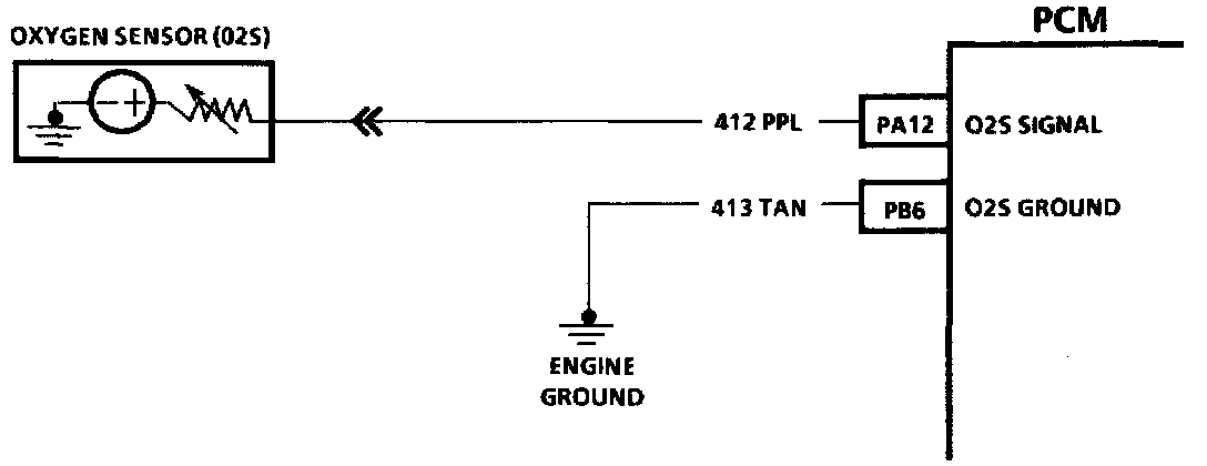 The Powertrain Control Module (PCM) supplies a voltage of about .45 volt between terminals "PA12" and "PB6". (If measured with a 10 megohm digital voltmeter, this may read as low as .32 volt.) The Oxygen Sensor (O2S) varies the voltage within a range of about 1 volt if the exhaust is rich, down to about .10 volt if exhaust is lean.