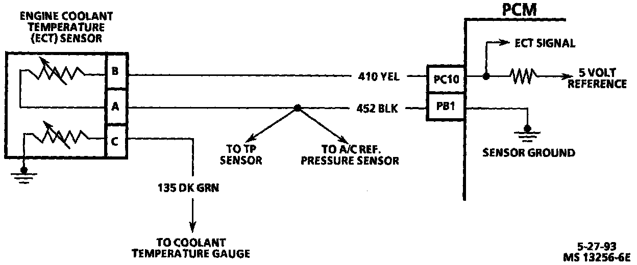 The Engine Coolant Temperature (ECT) sensor uses a thermistor to control the signal voltage to the Powertrain Control Module (PCM). The PCM supplies a 5 volt reference and ground to the sensor. When the engine is cold, the sensor (thermistor) resistance is high, therefore, PCM terminal "PC1O" voltage will he high.