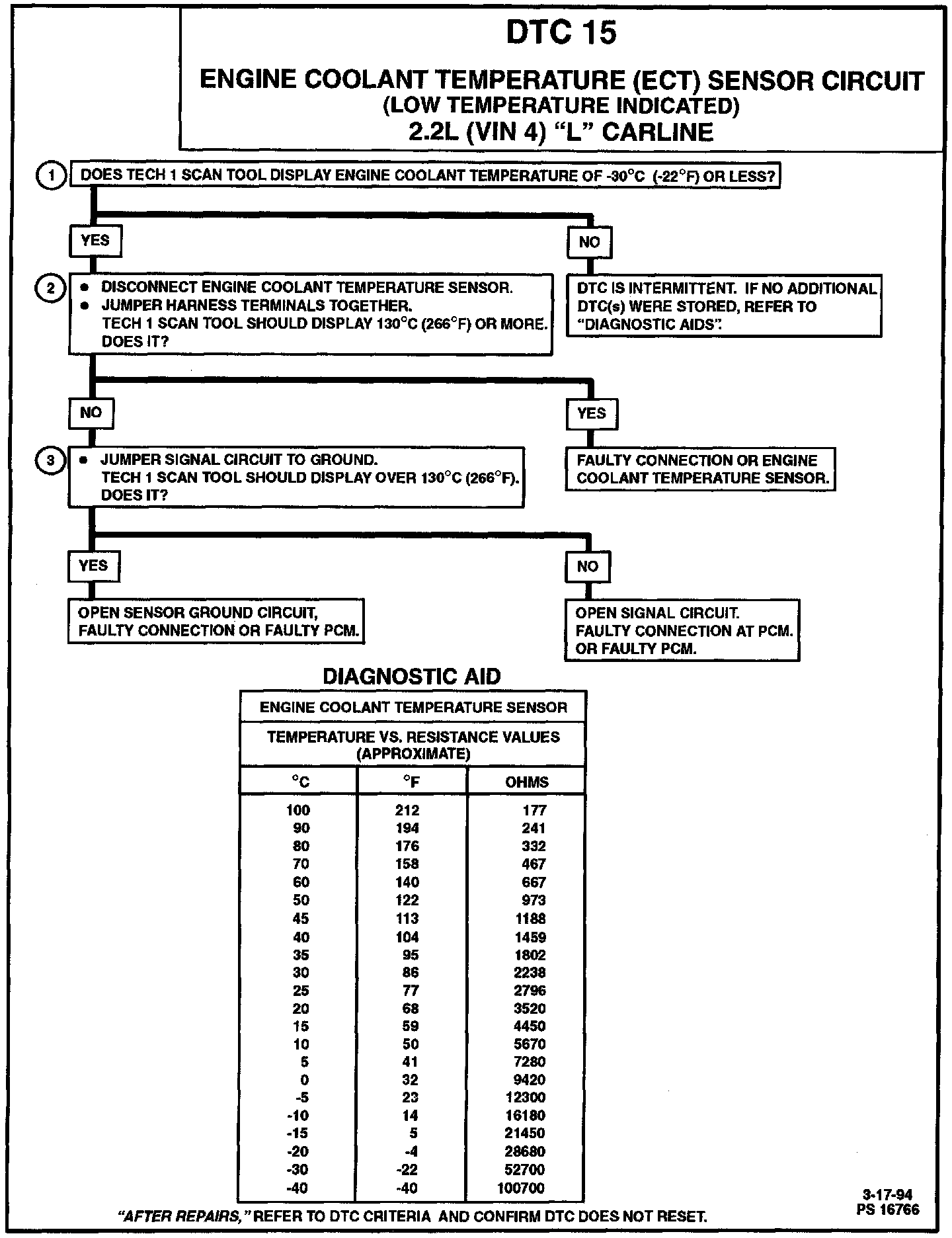 DTC 15 Engine Coolant Temperature (ECT) Sensor Circuit (Low Temperature Indicated):